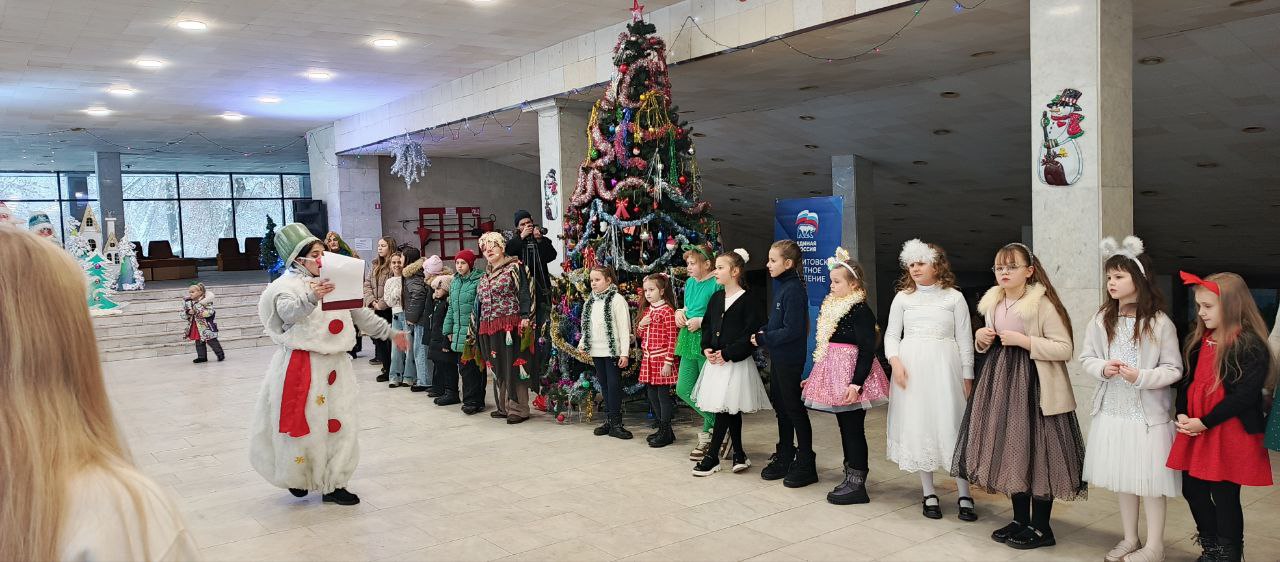 Для маленьких гостей была подготовлена насыщенная программа: сказочные персонажи провели весёлые конкурсы, интерактивные игры, задорные танцы и традиционные хороводы вокруг новогодней ёлки. Ребята с удовольствием включались в каждое действие, смеялись, поддерживали друг друга и делились своими мечтами о наступающем годе.