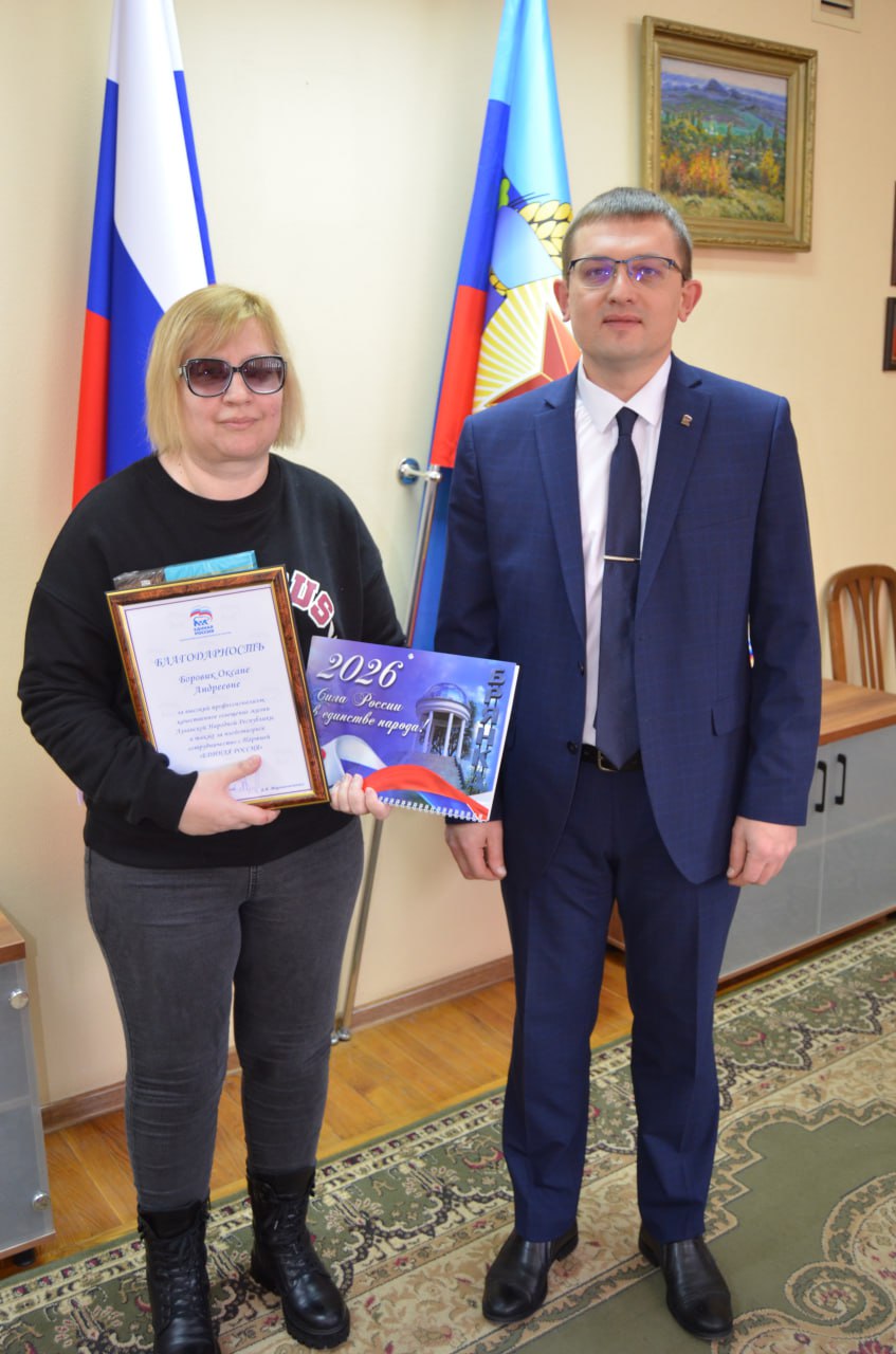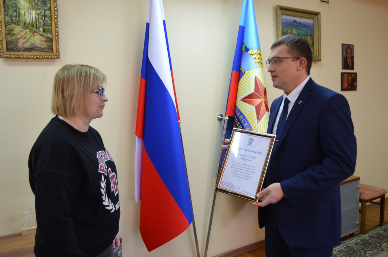Это заслуженная награда за высокий профессионализм и весомый вклад в объективное освещение жизни нашей Луганской Народной Республики, деятельности партии «Единая Россия» и, конечно, работы Брянковского местного отделения в частности.