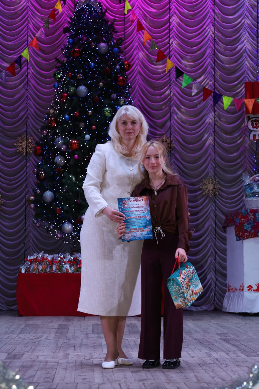 От имени Главы городского округа Наталии Жулинской Светлана Александровна поздравила всех с новогодними и рождественскими праздниками и пожелала крепкого здоровья, мира и благополучия. Юные артисты получили заслуженные благодарности и сладкие подарки, директор Дворца культуры Анна Пронь-Нестеренко также тепло поблагодарила весь дружный коллектив воспитанников и сотрудников за их неоценимый вклад в создание этого праздника.