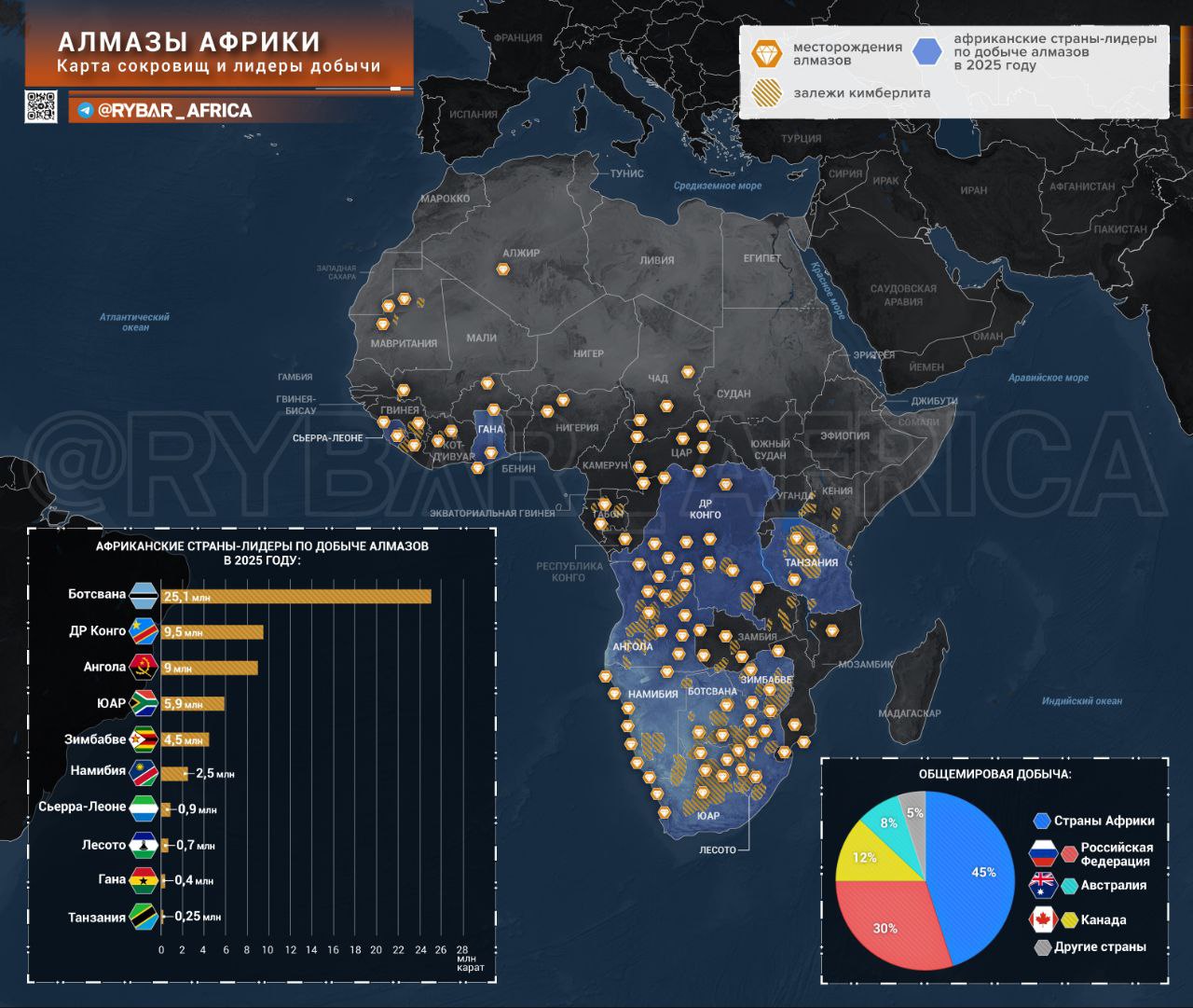 Несмотря на то, что алмазы в Африке можно встретить почти так же часто, как и золото, развить добычу получилось лишь в нескольких странах — в Ботсване, ЮАР, Анголе и ДР Конго. Именно здесь ещ при колонистах началась профессиональная добыча, и многие месторождения приносят прибыль столетиями.