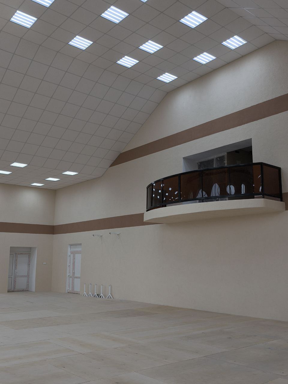Построен двухэтажный административно-бытовой корпус, где разместятся раздевалки, душевые, администрация и тренажёрный зал. Ведутся отделочные работы.