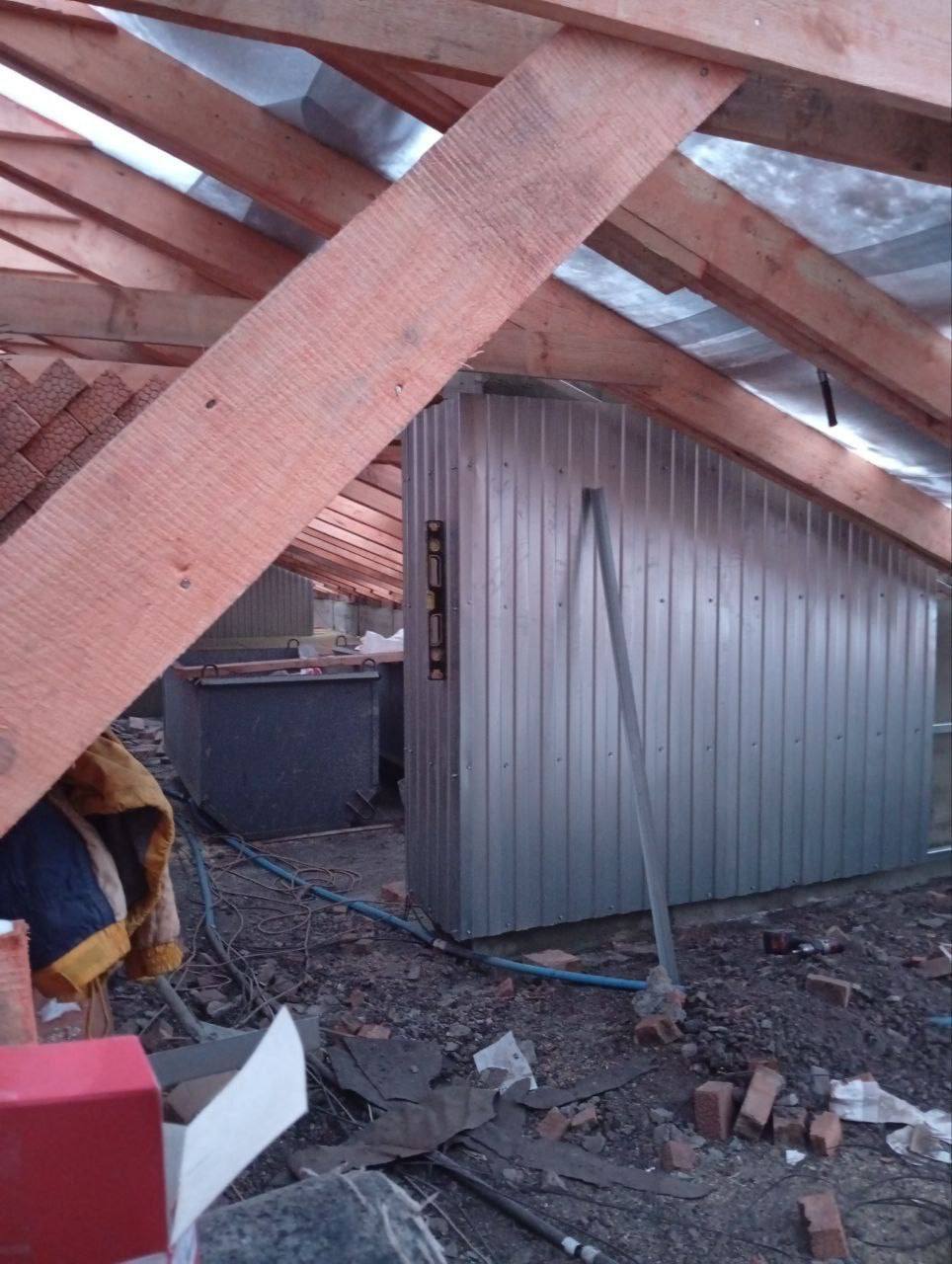В настоящее время кровельщики продолжают работу, выполняя демонтаж старого утепления и спуская его с помощью крана. Параллельно с этим идет укладка минеральной ваты и монтаж ходовых мостиков, а также обшивка вентиляционных каналов металлом. С наступлением благоприятных погодных условий строители приступят к работе на следующем подъезде, где будут проводиться аналогичные действия.