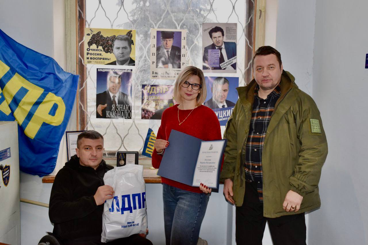 Координатор Краснолучского местного отделения ЛДПР Сергей Морозов совместно с представителем добровольческой разведывательно-штурмовой бригады «Невский» поздравил журналиста Марину Плугову с Днём российской печати.