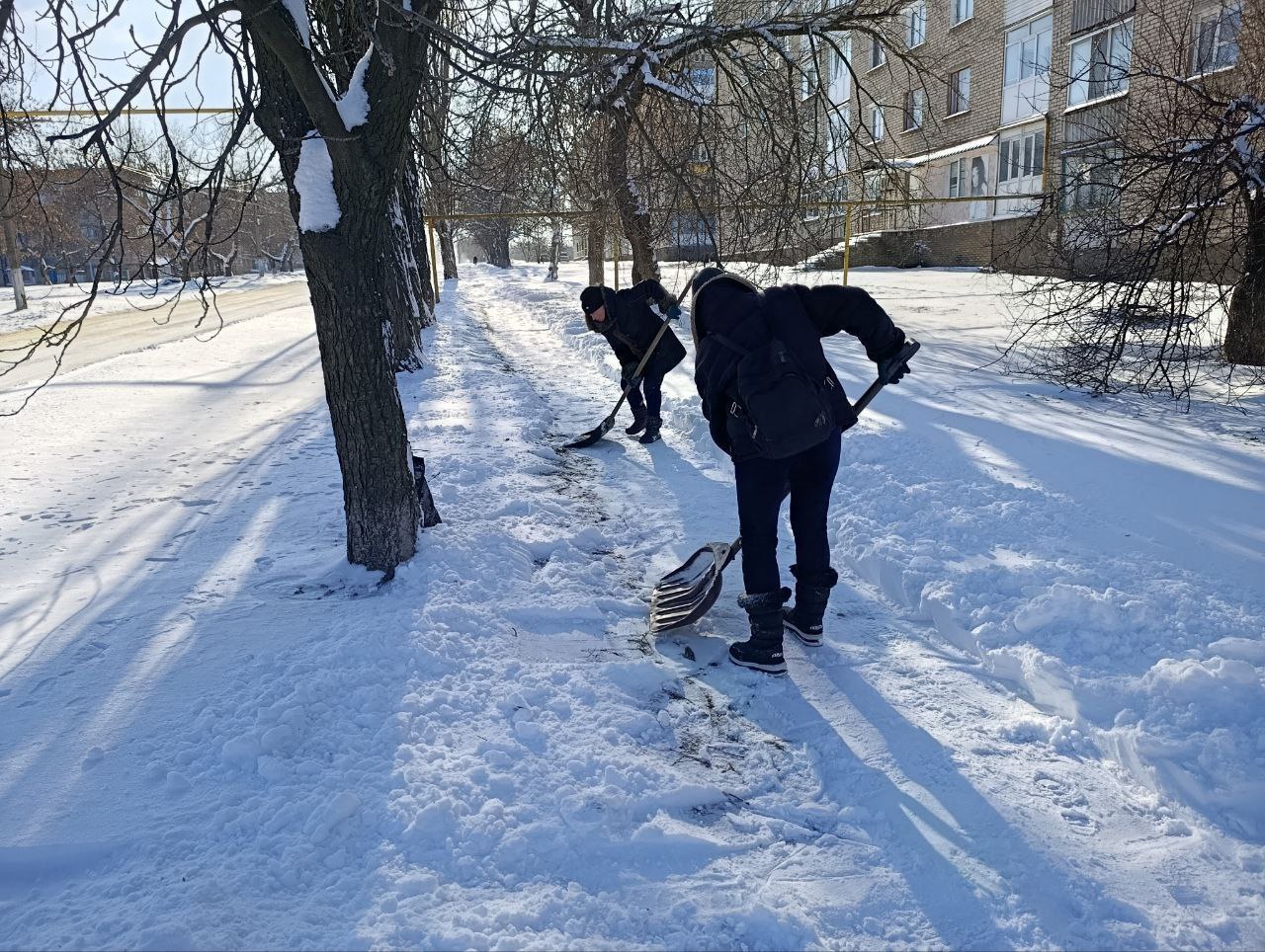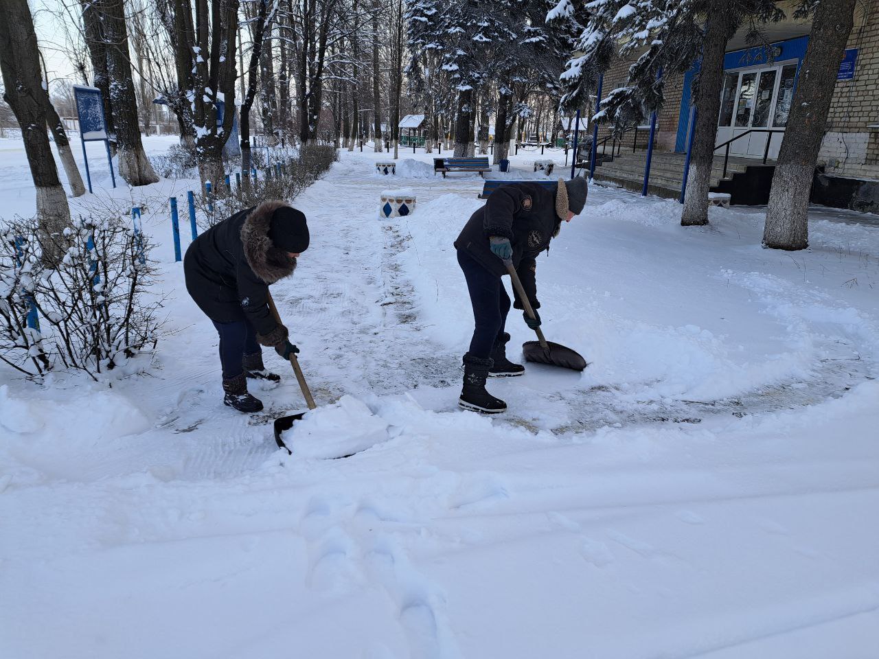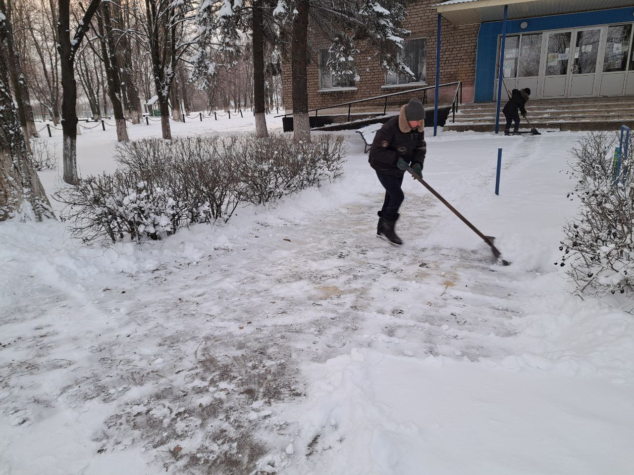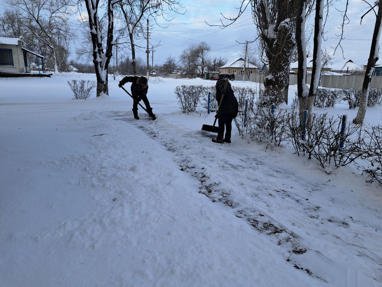 Сегодня работниками отдела жизнеобеспечения пгт Ясеновский Администрации городского округа город Ровеньки выполнены работы по расчистке от снега ручным способом территории, прилегающей к зданию отдела и тротуара по ул. Ленина.