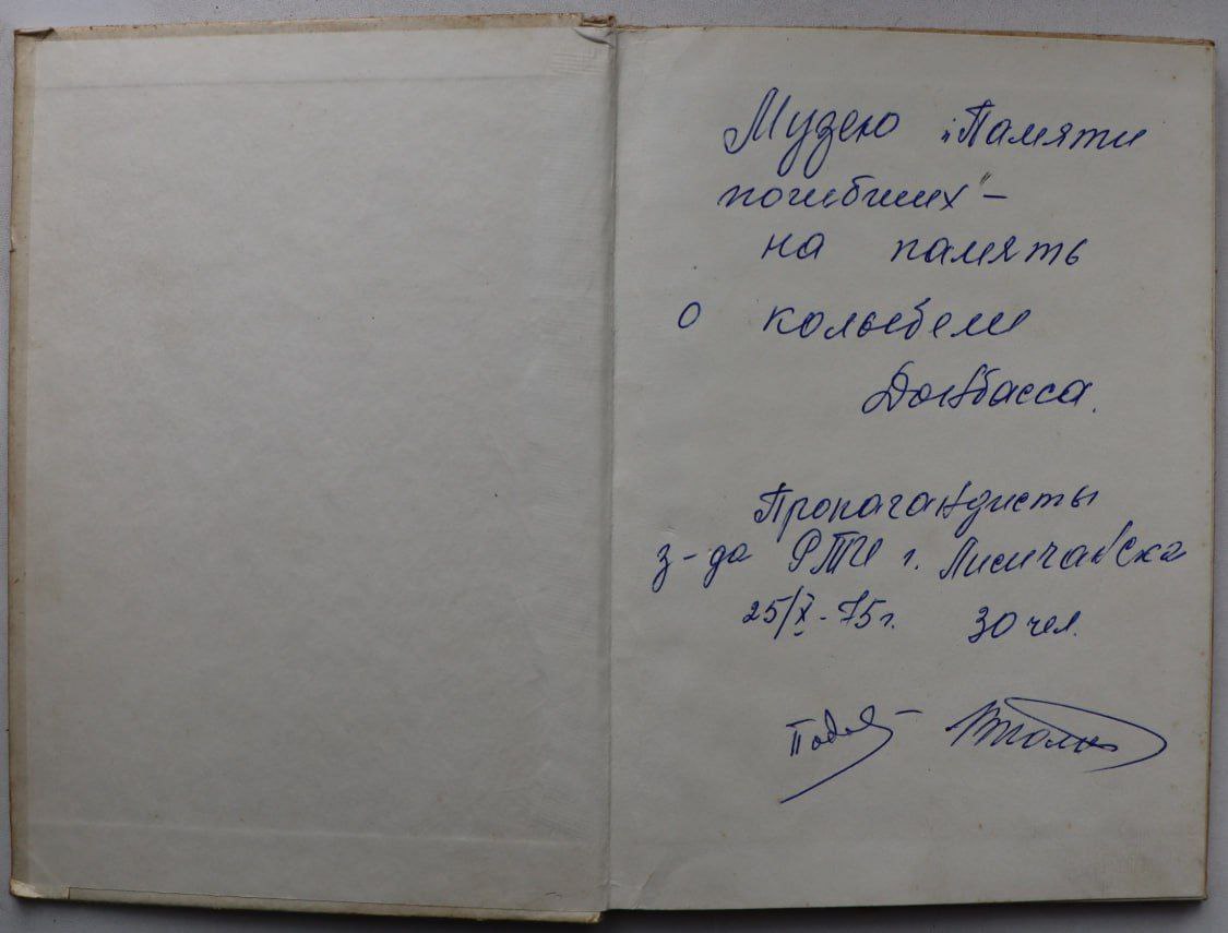Один её экземпляр был подарен музею истории в Ровеньках. Он имел дарственную надпись "Музею "Памяти погибших" на память о колыбели Донбасса. Пропагандисты з-да РТИ г. Лисичанска 25/10-75 г. 30 чел. "