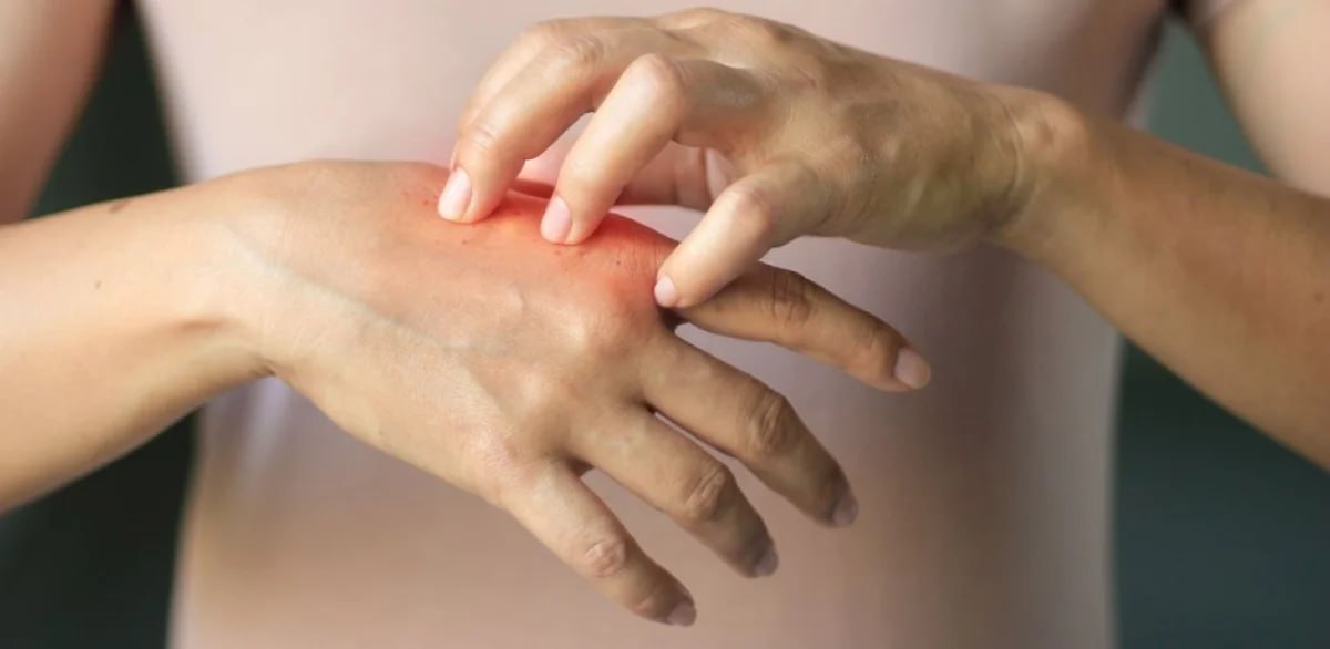 Атопический дерматит (нейродермит) — сухость, шелушение, зуд, покраснение, особенно в складках (локтевые и подколенные сгибы), на лице и кистях рук.