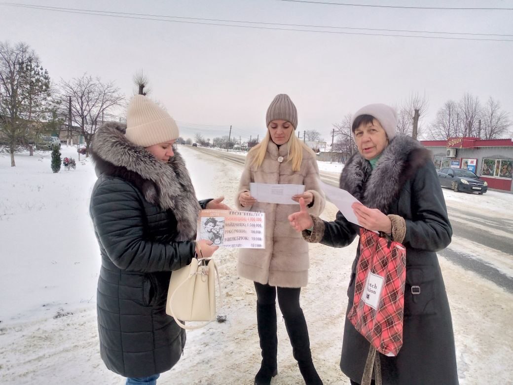 В ходе акции жители поселка получили тематические плакаты "Холокост - это не должно повториться!" В них было отражено напоминание о миллионах погибших евреев, цыган, славян, пленных, инакомыслящих.