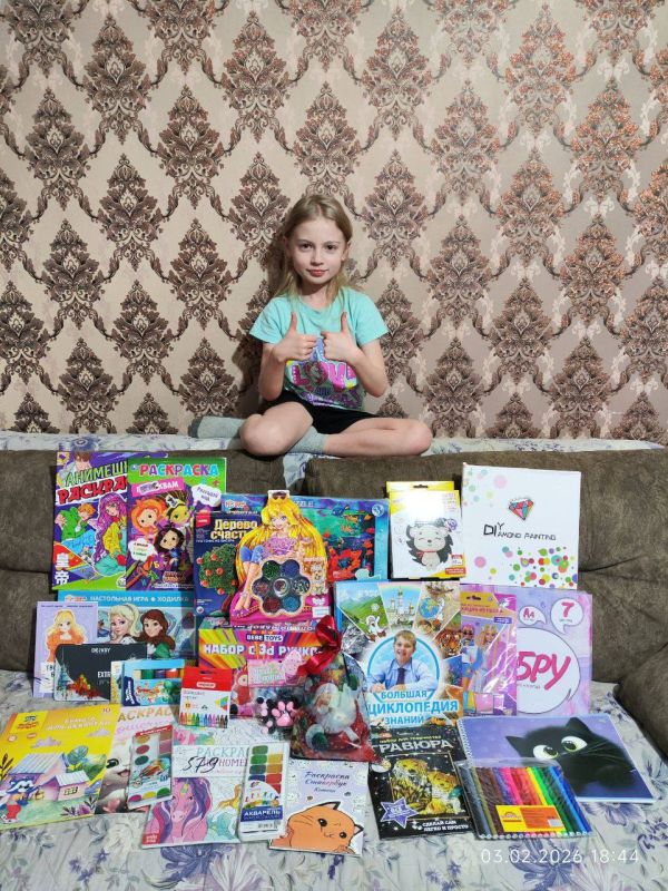 Юлия Ершова подобрала подарки, ориентируясь на увлечения ребенка. Девочка получила большой набор для 3D-рисования с трафаретами, алмазную мозаику и эбру для создания завораживающих картин, большую энциклопедию, сладкий новогодний подарок, а также множество разнообразных наборов для творчества.