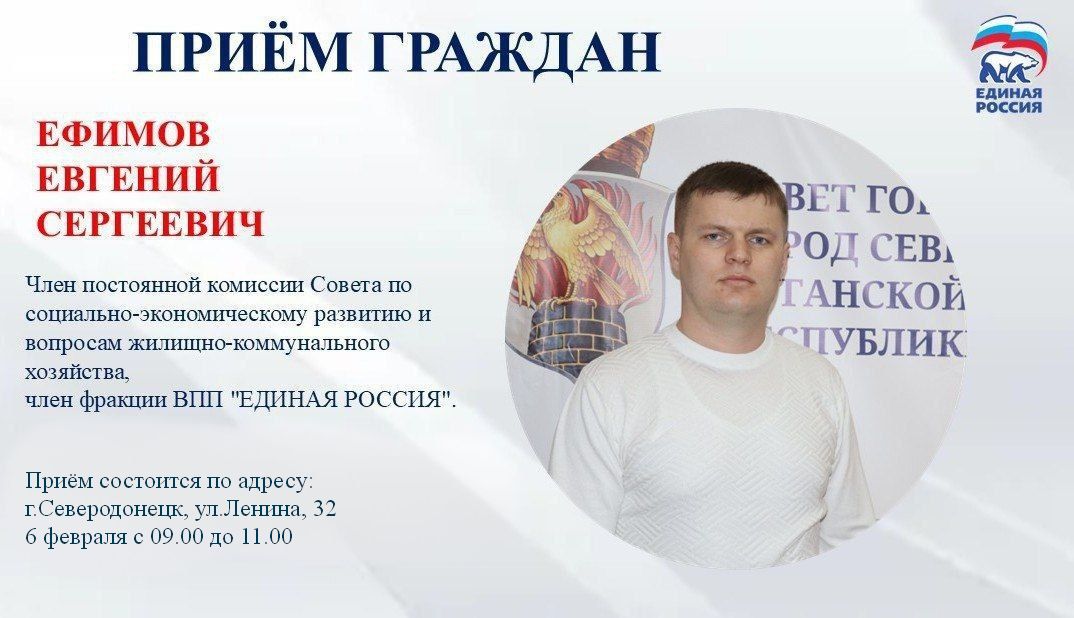 6 февраля с 09.00 до 11.00 прием граждан проведет депутат Совета городского округа город СеверодонецкЕфимов Евгений Сергеевич - член постоянной комиссии Совета по социально-экономическому развитию и вопросам жилищно-коммунального хозяйства, член фракции ВПП "ЕДИНАЯ РОССИЯ".