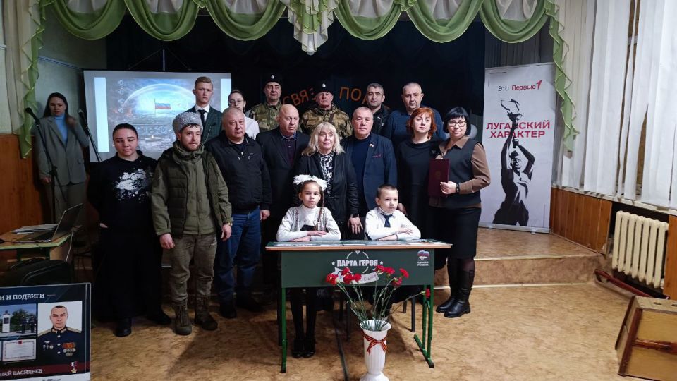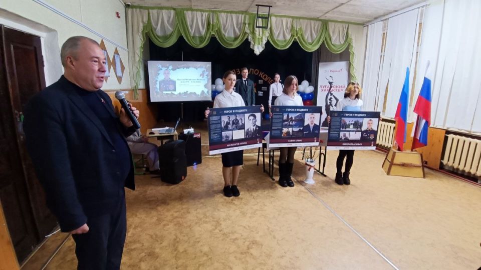 Он также передал в дар школе стенды из передвижной выставки «Герои и подвиги: мои земляки – Герои России». На них изображены Герои, отдавшие жизни, защищая Кременную: Николай Васильев, Ахмед Мальсагов, Алмаз Сафин.