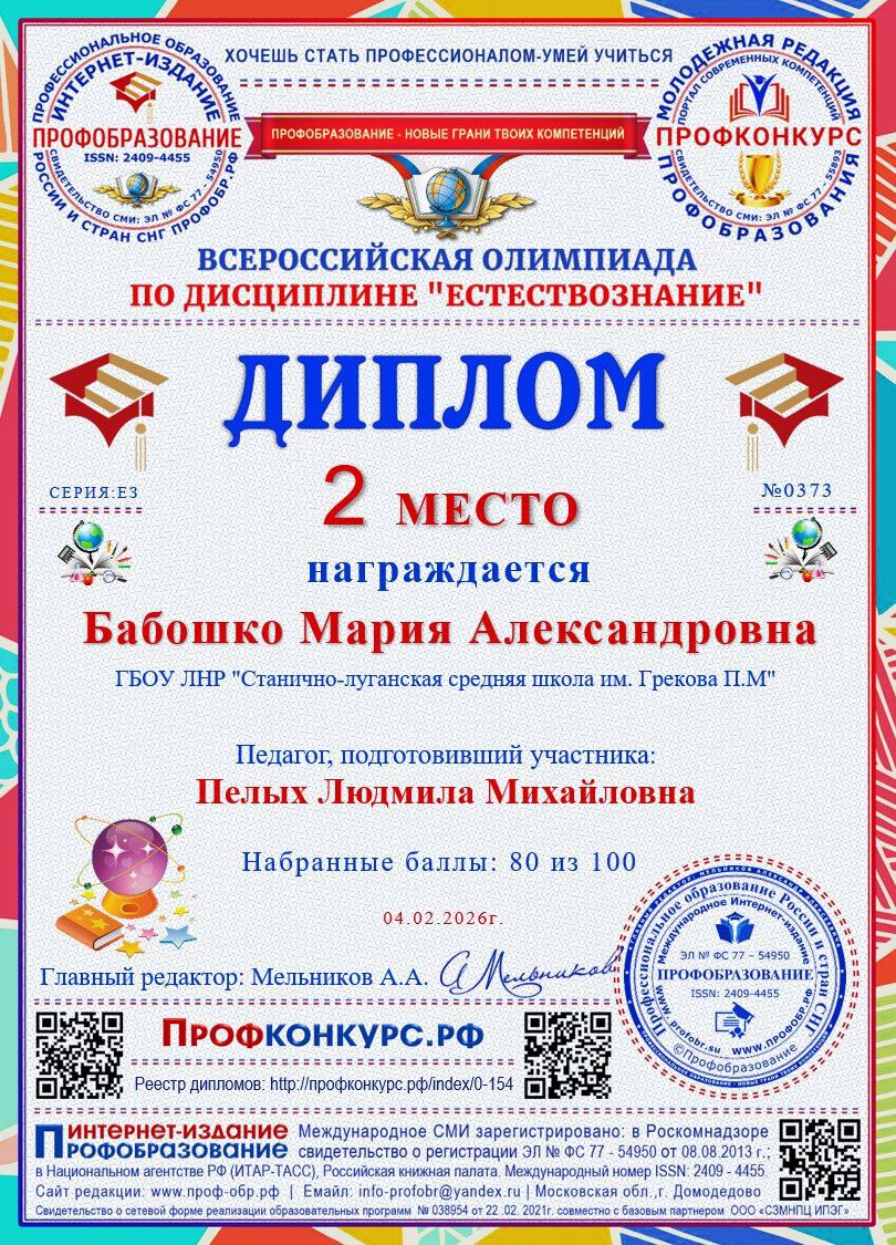 Поздравляем ученицу 9 класса Станично-Луганской средней школы имени Грекова П.М. Марию Бабошко!