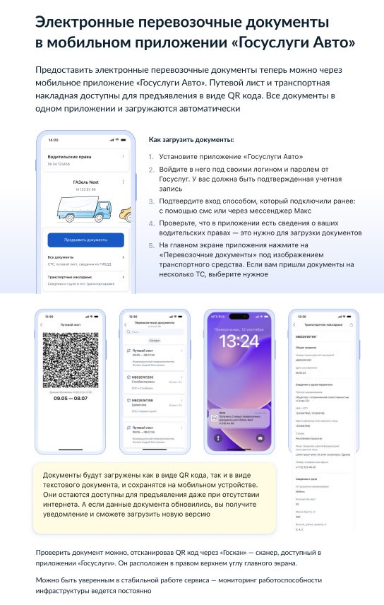 Кроме того, Минтрансом России совместно с Министерством цифрового развития, связи и массовых коммуникаций Российской Федерации обеспечивается развитие сервиса предъявления водителями на дороге электронных перевозочных документов (транспортная накладная и путевой лист) с использованием мобильного приложения «Госуслуги Авто» в формате двухмерного штрихового кода (QR-кода). Сведения в личный кабинет приложения поступают проактивно и в неизменном виде из ГИС ЭПД.