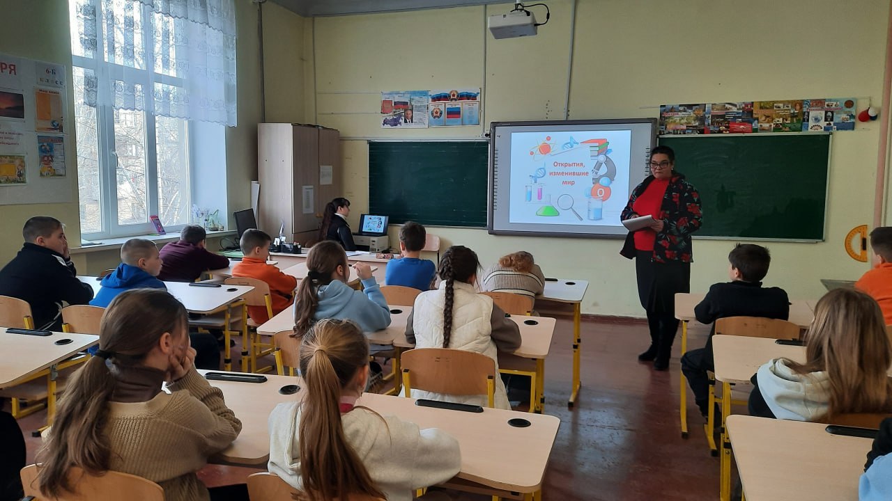 Сотрудники городского Дворца культуры провели для учеников 6-Б класса Рубежанской основной школы №3 презентацию «Науку двигают учёные, мечтой и знаньем окрылённые»