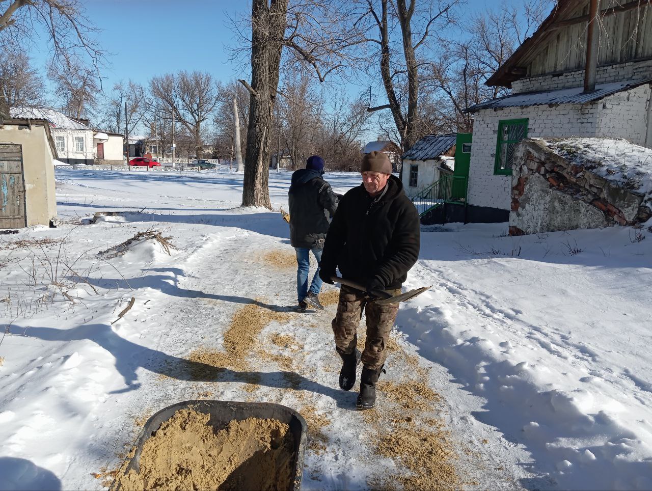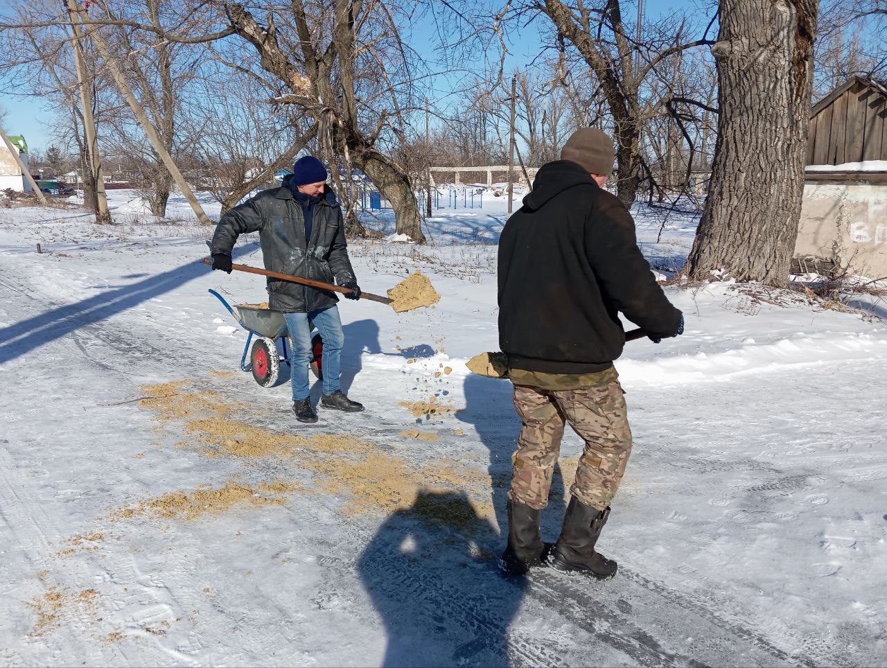 Ведётся посыпка тротуаров песком, что снижает риск падений и травм жителей посёлков.