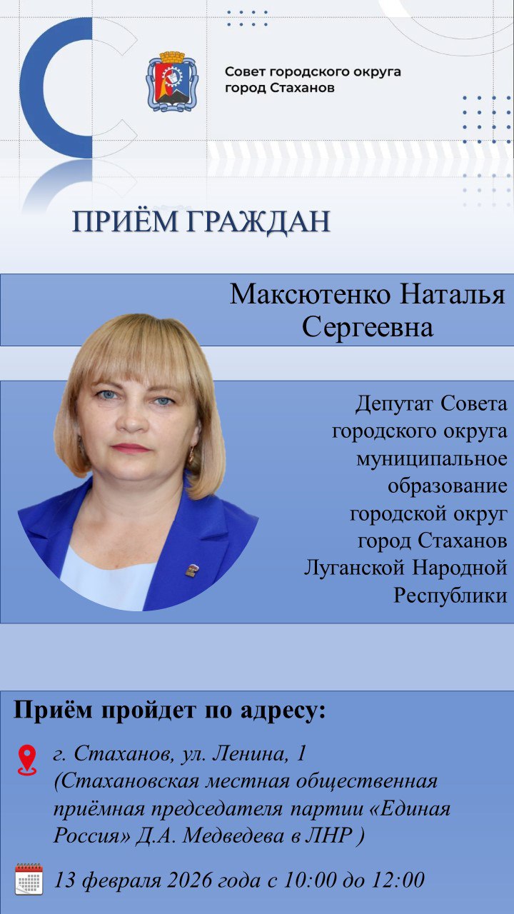 Личный приём граждан депутатом Совета городского округа город Стаханов Максютенко Натальей Сергеевной