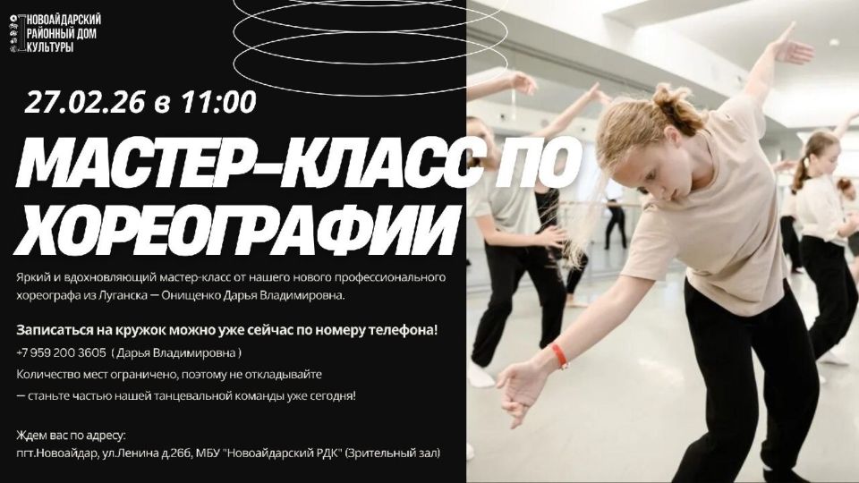 27 февраля 2026 года в 12:00 состоится яркий и вдохновляющий мастер-класс от нашего нового профессионального хореографа из Луганска — Онищенко Дарья Владимировна.