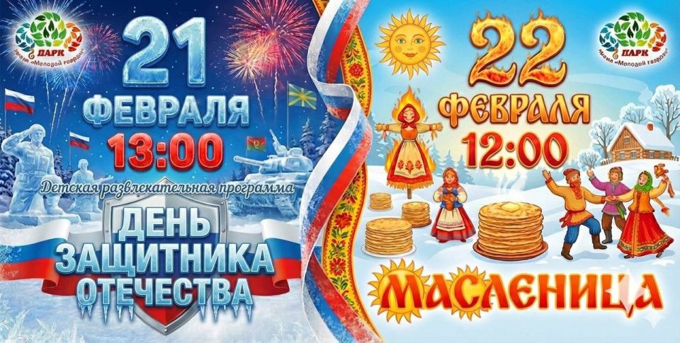 Краснодонский городской парк им. "Молодой Гвардии" приглашает гостей и жителей города на праздничные мероприятия, посвященные Дню Защитника Отечества и празднику Масленицы.