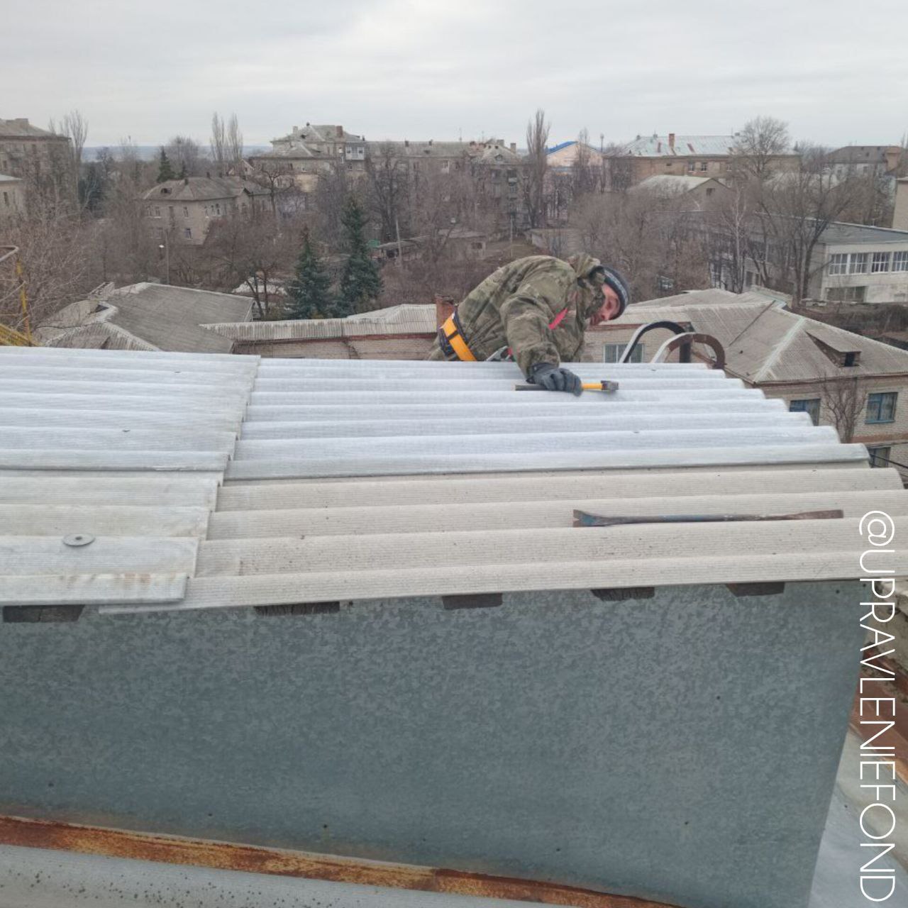 Целостность кровли была восстановлена. Вместо утраченных листов шифера, разбитых ветром, были проложены новые, а старые листы дополнительно укреплены. В ремонтных работах также участвовала спецтехника – автовышка.