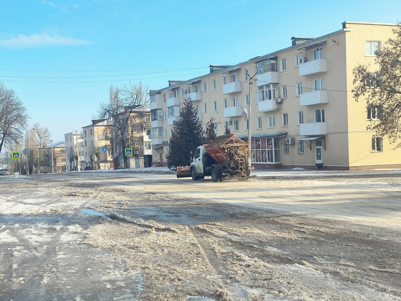 В пятницу проводилась обработка основных направлений, пешеходных зон и наиболее опасных участков противогололедными материалами от образовавшейся наледи.