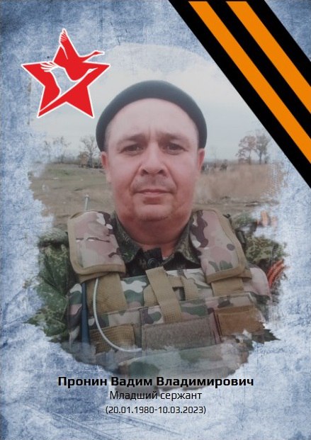 Младший сержант Пронин Вадим Владимирович 10 марта 2023 года погиб при выполнении боевого задания в населенном пункте Золотарёвка Луганской Народной Республики.