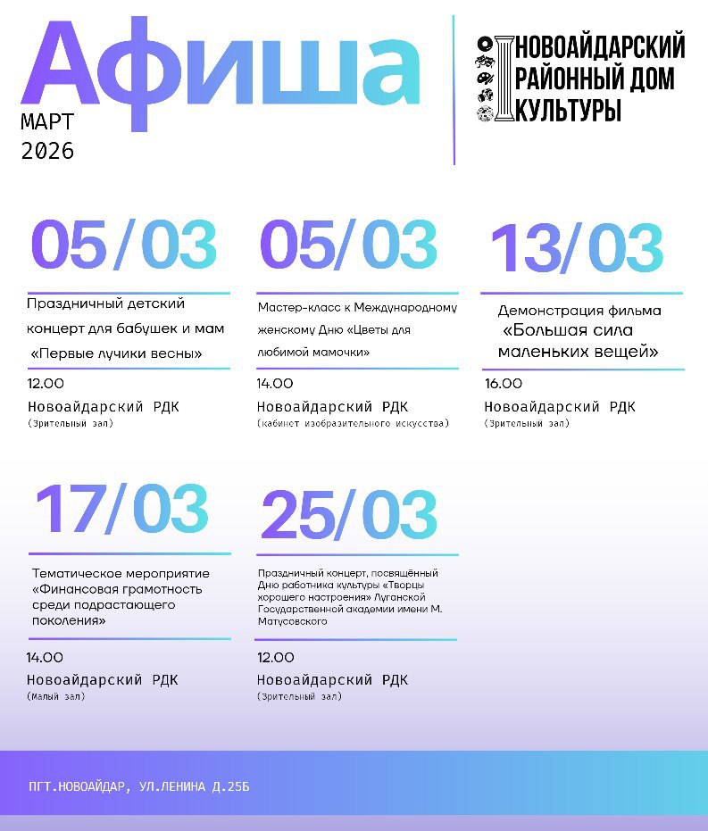 Друзья, мы представляем вам насыщенную программу на 05.03.2026 14:00 Мастер-класс к Международному женскому Дню «Цветы для любимой мамочки» - Класс декоративно-прикладного искусства Новоайдарского РДК 05.03.2026 12:00 Праздничный детский концерт для бабушек имам «Первые лучики весны» - Зрительный зал Новоайдарского РДК 13.03.2026 16:00 Демонстрация фильма «Большая сила маленьких вещей» - Зрительный зал Новоайдарского РДК 17.03.2026 - 14:00 Тематическое мероприятие «Финансовая грамотность среди подрастающего поколения» - Малый зал Новоайдарского РДК 25.03.2026 12:00 Праздничный концерт, посвящённый Дню работника культуры «Творцы хорошего настроения» Луганской Государственной академии имени М. Матусовского - Зрительный зал Новоайдарского РДК Не пропустите возможность интересно и весело провести время с семьями и друзьями. Ждем вас на наших праздниках — создадим настроение вместе! Возможны изменения следите за новостями!