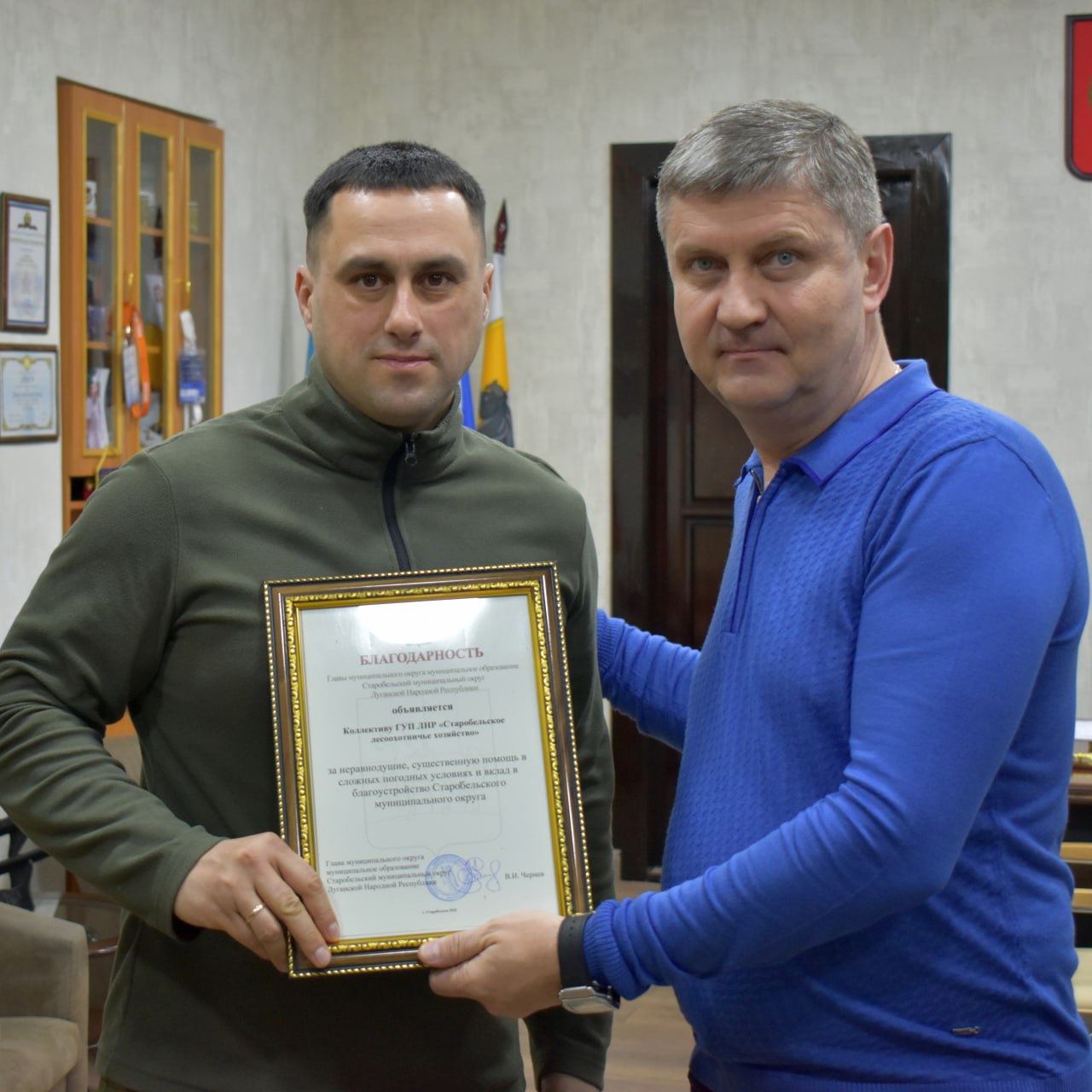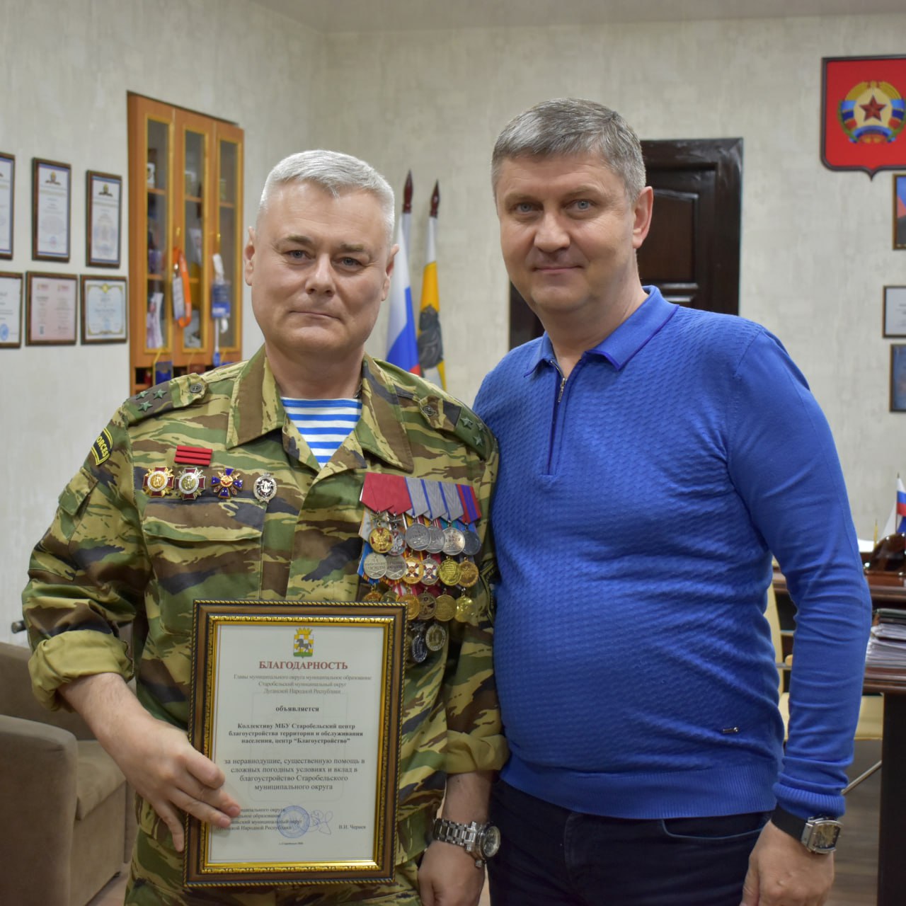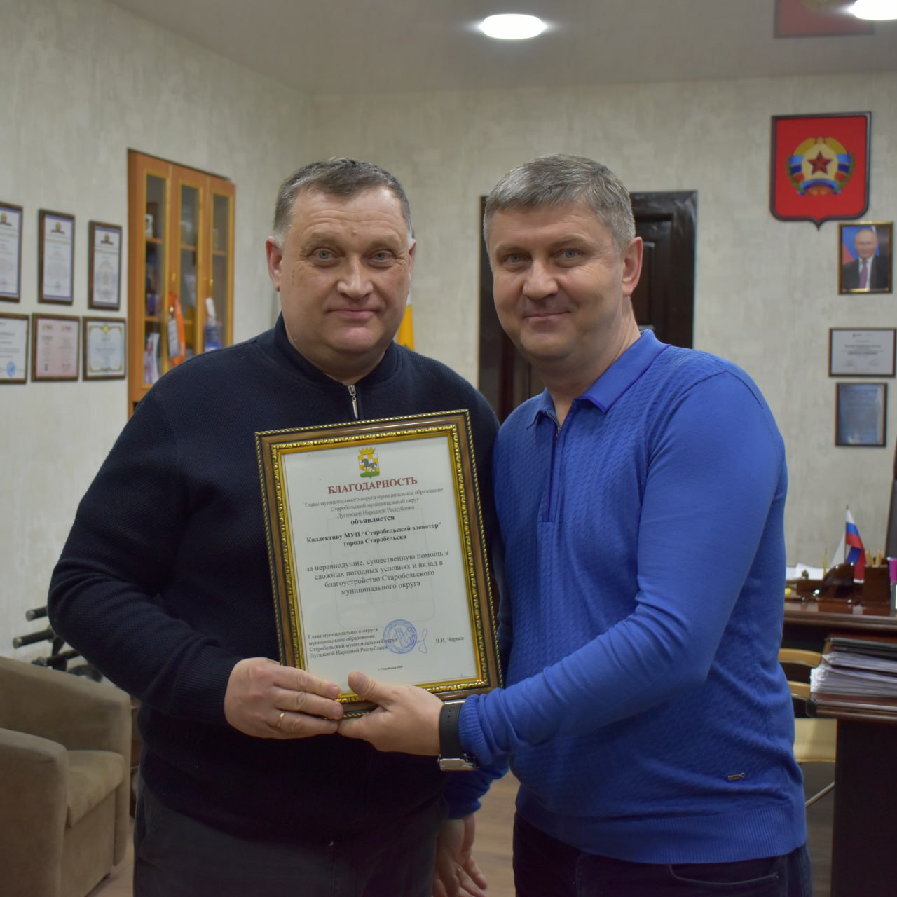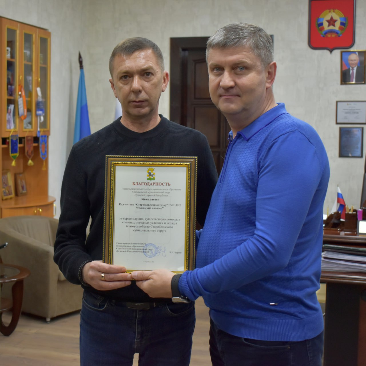 Сегодня вручил благодарности коллективам организаций и предприятий Старобельского муниципального округа за неравнодушие, оперативность и существенный вклад в благоустройство территории в зимний период.