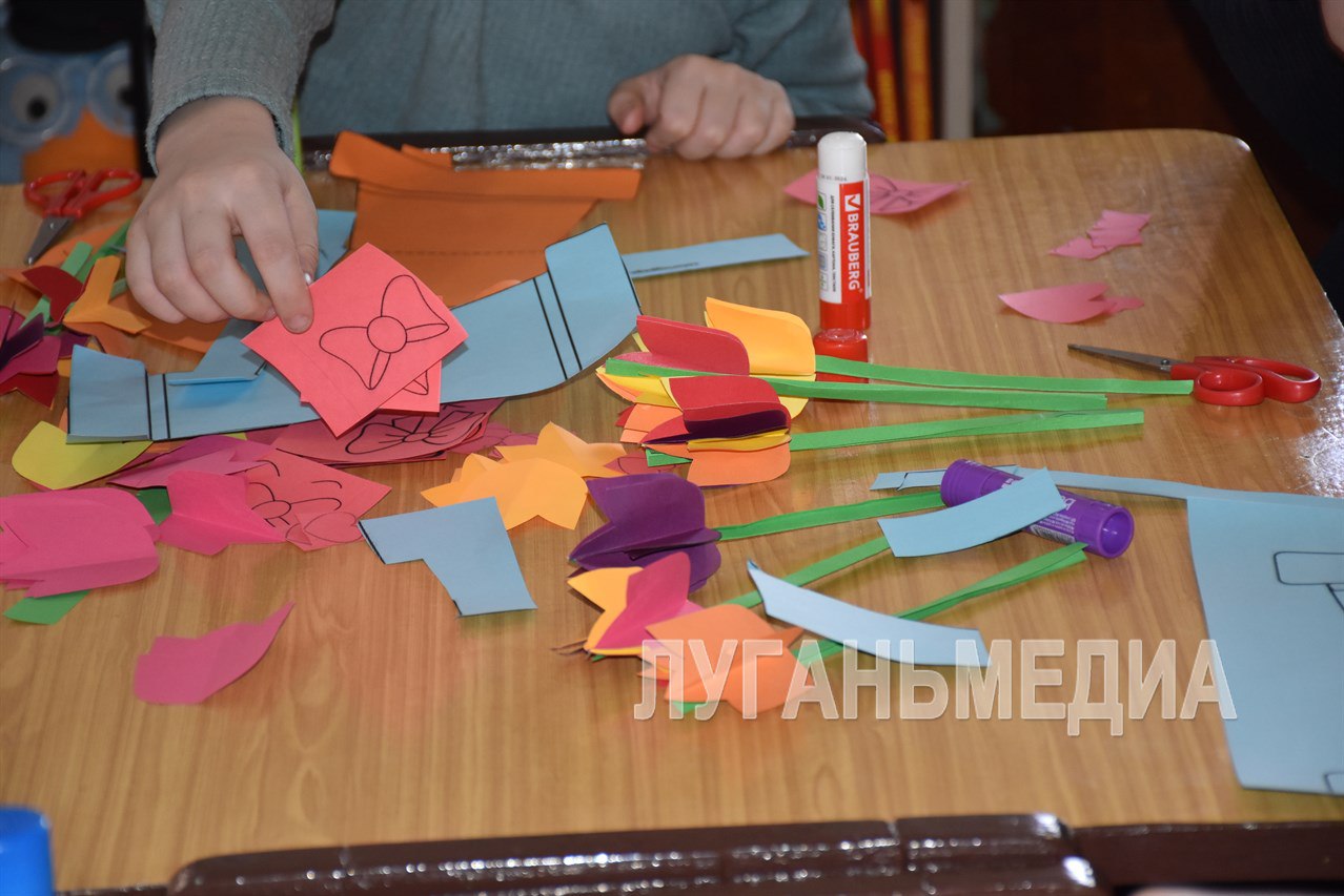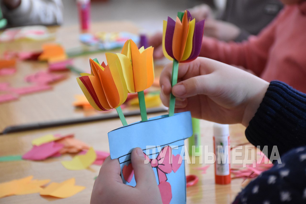 Цветная бумага, клей и старания ребят сделали свое дело. Мальчики и девочки создали рукотворный подарок к Международному женскому дню – яркий букет тюльпанов.