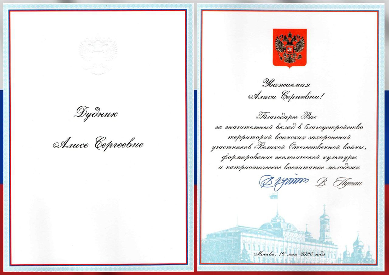 Методист Республиканского центра туризма, экологии и краеведения «Возрождение» Алиса Дудник получила Благодарственное письмо Президента РФ «…за значительный вклад в благоустройство территорий воинских захоронений участников Великой Отечественной войны, формирование экологической культуры и патриотическое воспитание молодёжи».