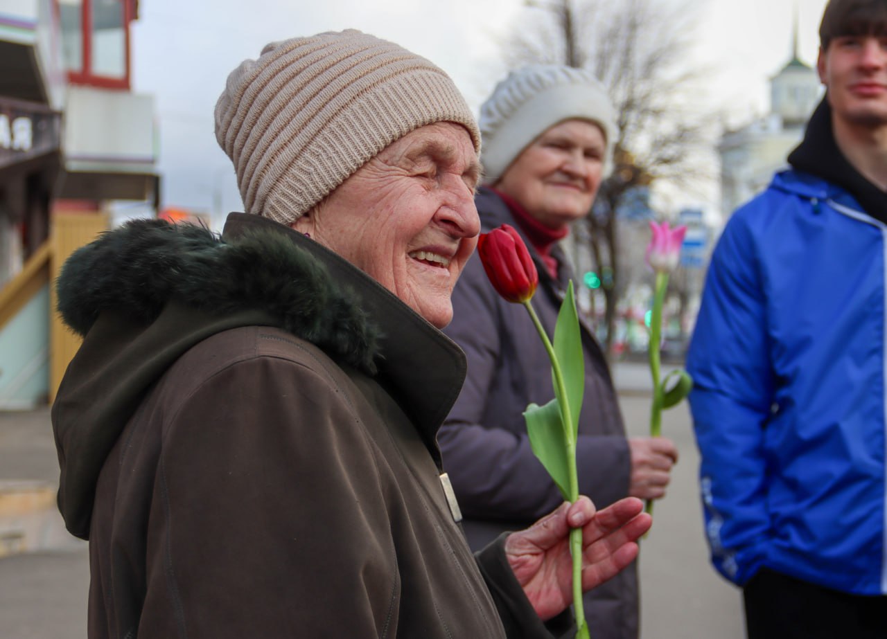Женщины и девушки получили в подарок тюльпаны – главный символ весны и женственности. Не обошлось и без теплых слов в адрес виновниц торжества.