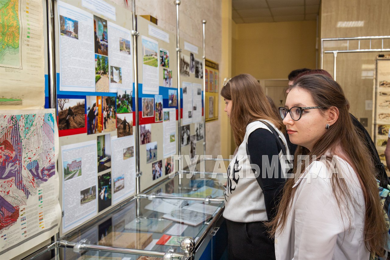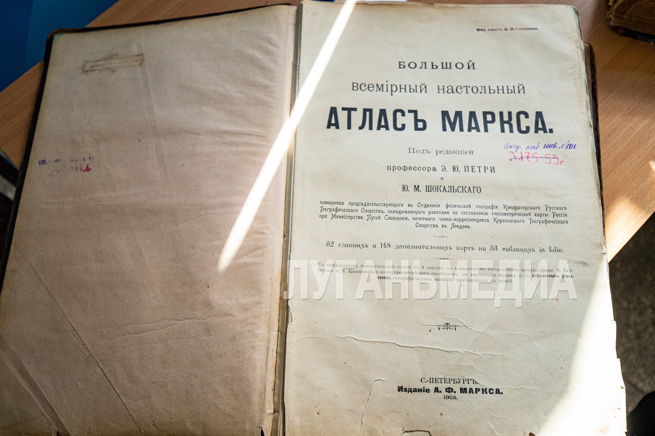 На выставке были представлены уникальные картографические коллекции из фондов ГКУ «Госархив ЛНР». Среди них – топографические карты времен Великой Отечественной войны и специальные планы земельных участков XIX–XX веков. Кафедра географии и туризма ЛГПУ продемонстрировала ценные издания: общегеографический атлас мира Ричарда Андре 1904 года на немецком языке и Большой всемирный настольный атлас Адольфа Маркса 1905 года, признанный эталоном справочно-географической литературы начала XX века.