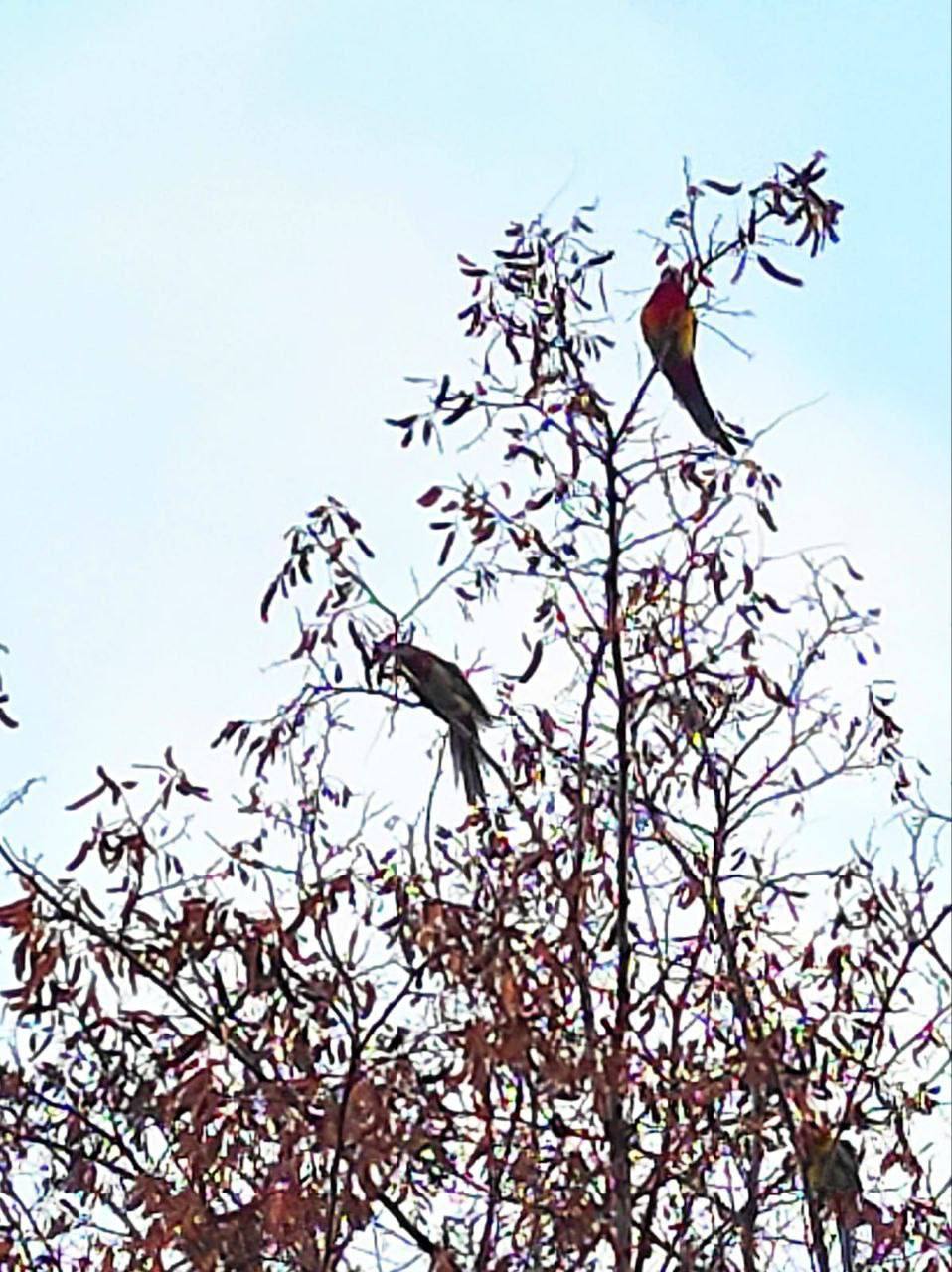 Они сидят на ветках, лакомятся семенами акации и совершенно не боятся города.