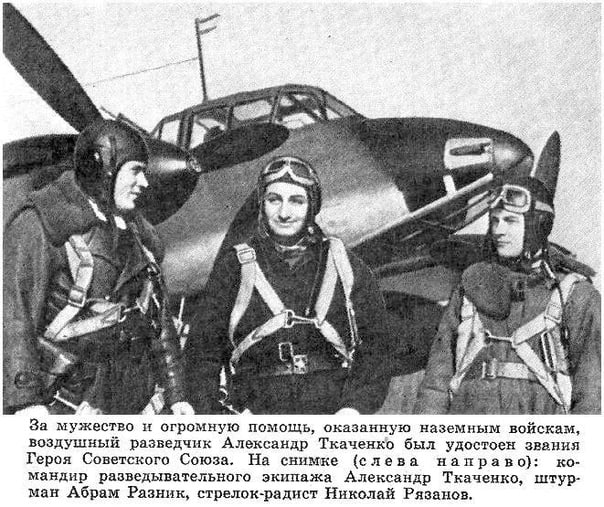 На фронтах Великой Отечественной войны Ткаченко Александр с октября 1941г. Командир эскадрильи 13-го отдельного разведывательного авиационного полка (13-я воздушная армия, Ленинградский фронт) капитан Ткаченко к октябрю 1944г. совершил 175 боевых вылетов на разведку и фотографирование скоплений войск и объектов противника. В 15 воздушных боях лично сбил 1 самолет и в группе 4 самолета врага. Звание Героя Советского Союза присвоено 23.02.45.