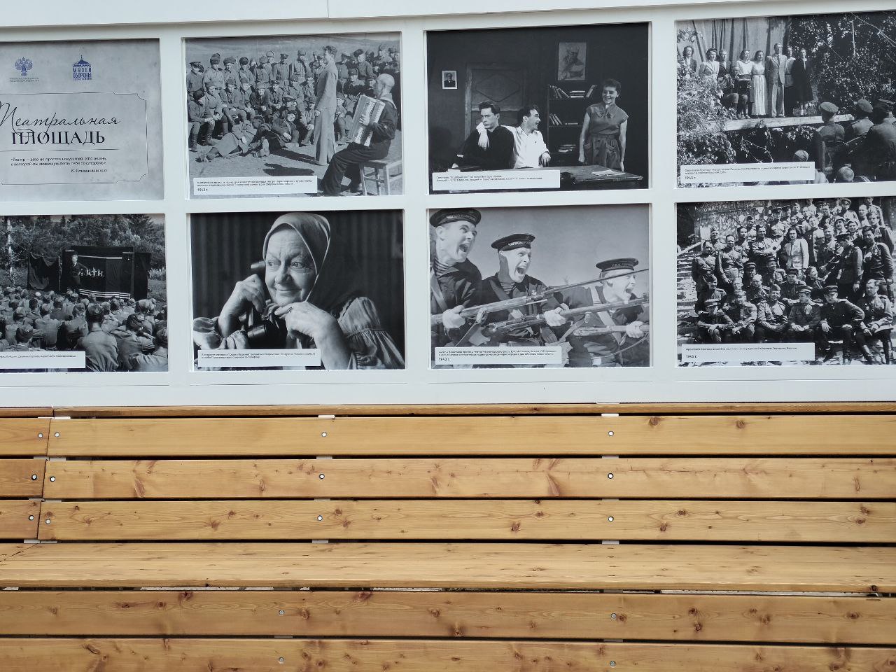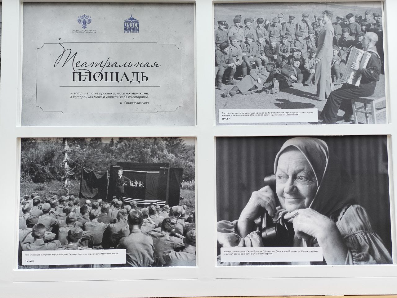 Посетители выставки увидели фотографии, запечатлевшие постановки, которые проходили в самых неожиданных местах — от солдатских блиндажей до полуразрушенных зданий прифронтовых городов.
