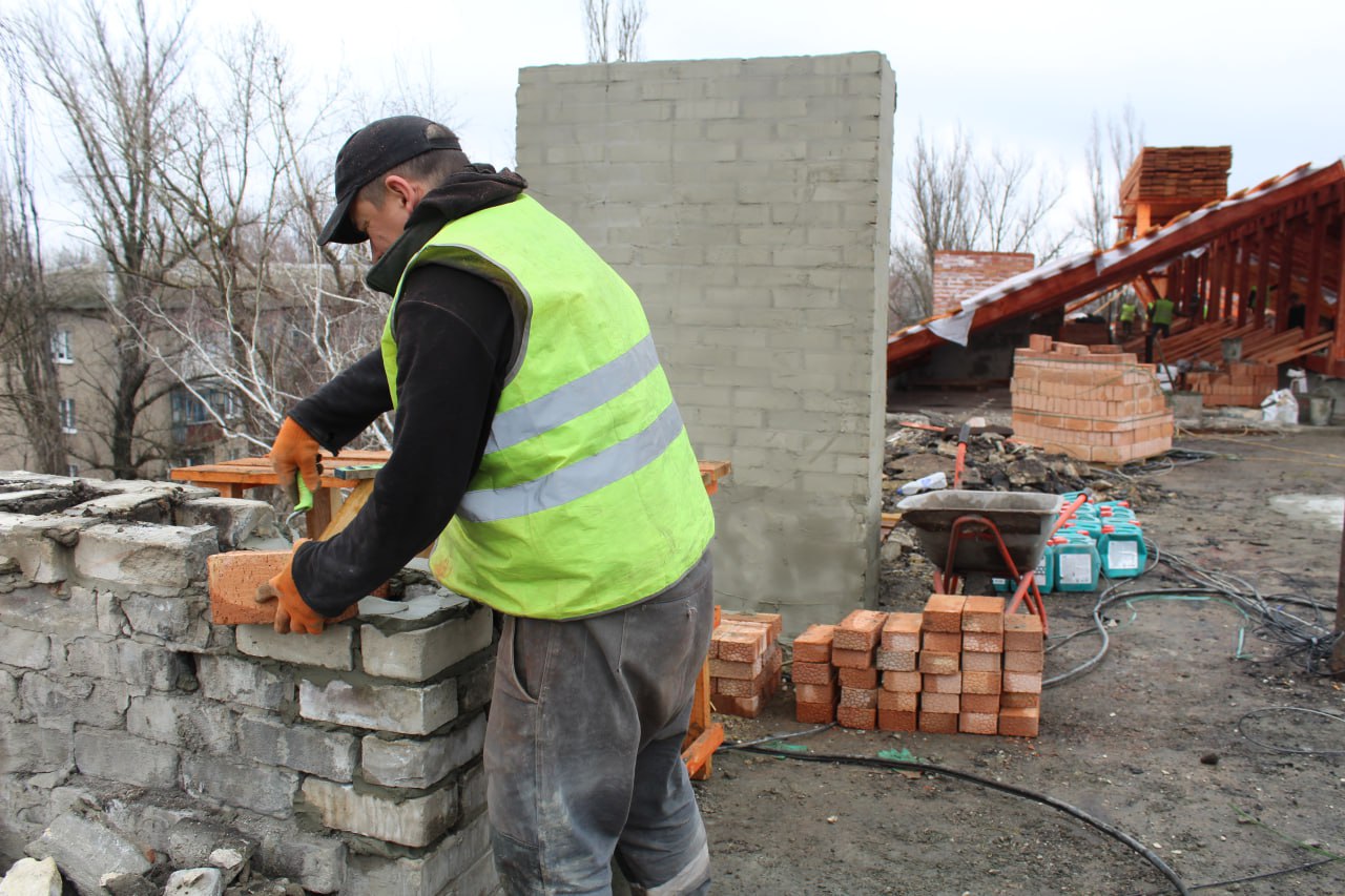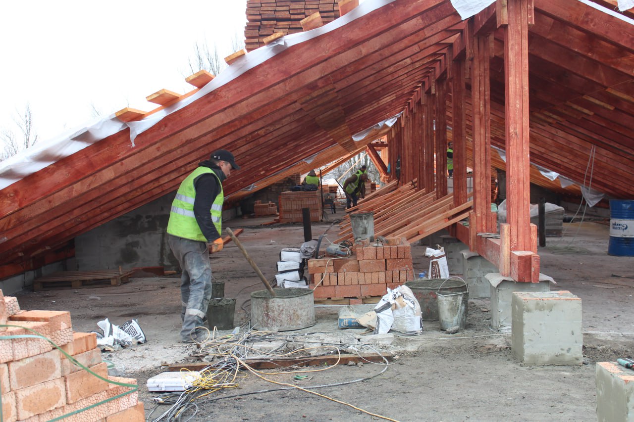 На сегодняшний день на трех подъездах данного многоквартирного дома специалисты завершили работы по устройству парапетов путем устройства кирпичной кладки, работы по кладке ДВК и устройству стропильной системы. Помимо этого, завершаются работы по устройству обрешетки.