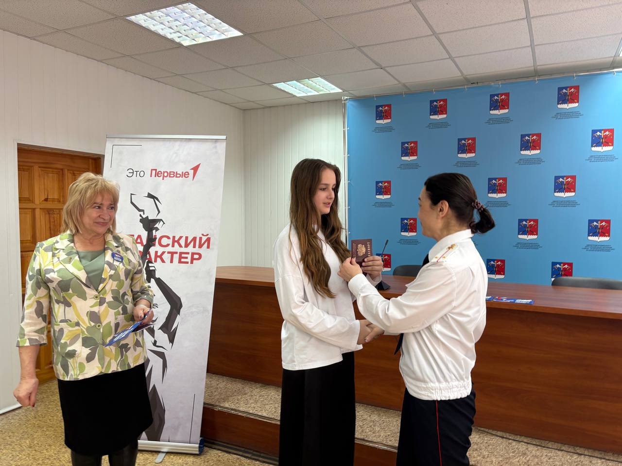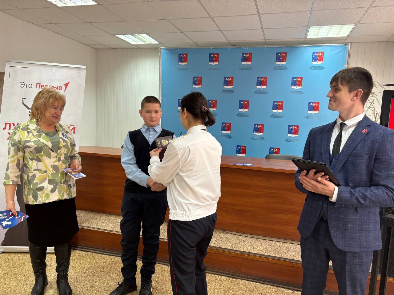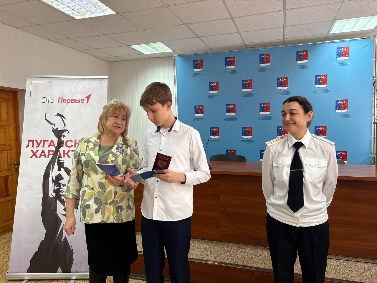 Главный документ гражданина Российской Федерации из рук инспектора отдела по вопросам миграции Станично-Луганского отдела МВД России, старшего лейтенанта полиции Елены Антиповой, получили жители Станично-Луганского Муниципального округа, которым в этом году исполнилось 14 лет: