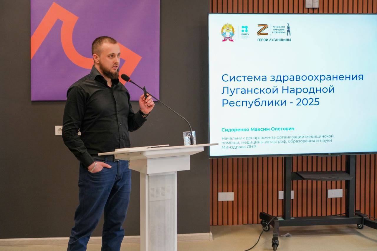 Перед участниками проекта, в числе которых были Валерий Татаренко и Екатерина Аксенова, выступил начальник департамента организации медицинской помощи, медицины катастроф, образования и науки Министерства здравоохранения ЛНР Максим Олегович Сидоренко.