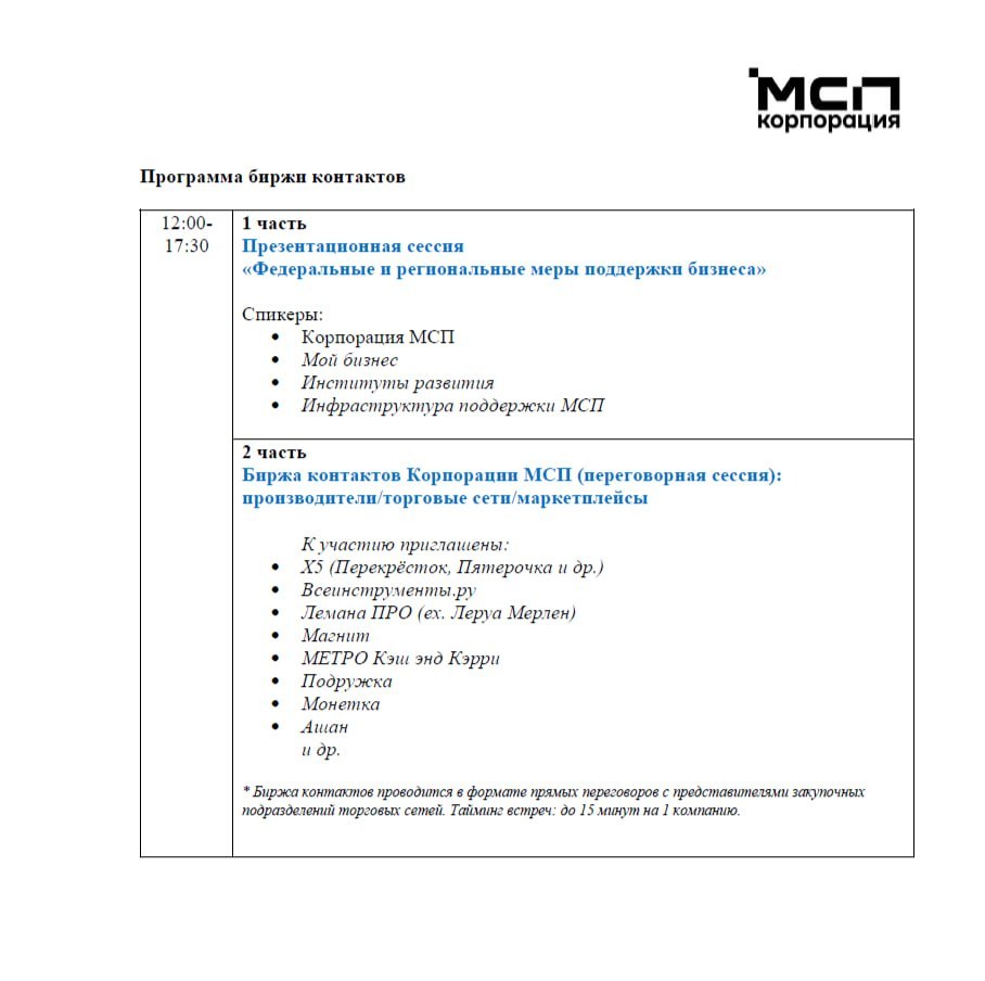 АО «Корпорация «МСП» организует биржу контактов между торговыми сетями и субъектами малого и среднего предпринимательства — поставщиками и производителями непродовольственных и продовольственных товаров.