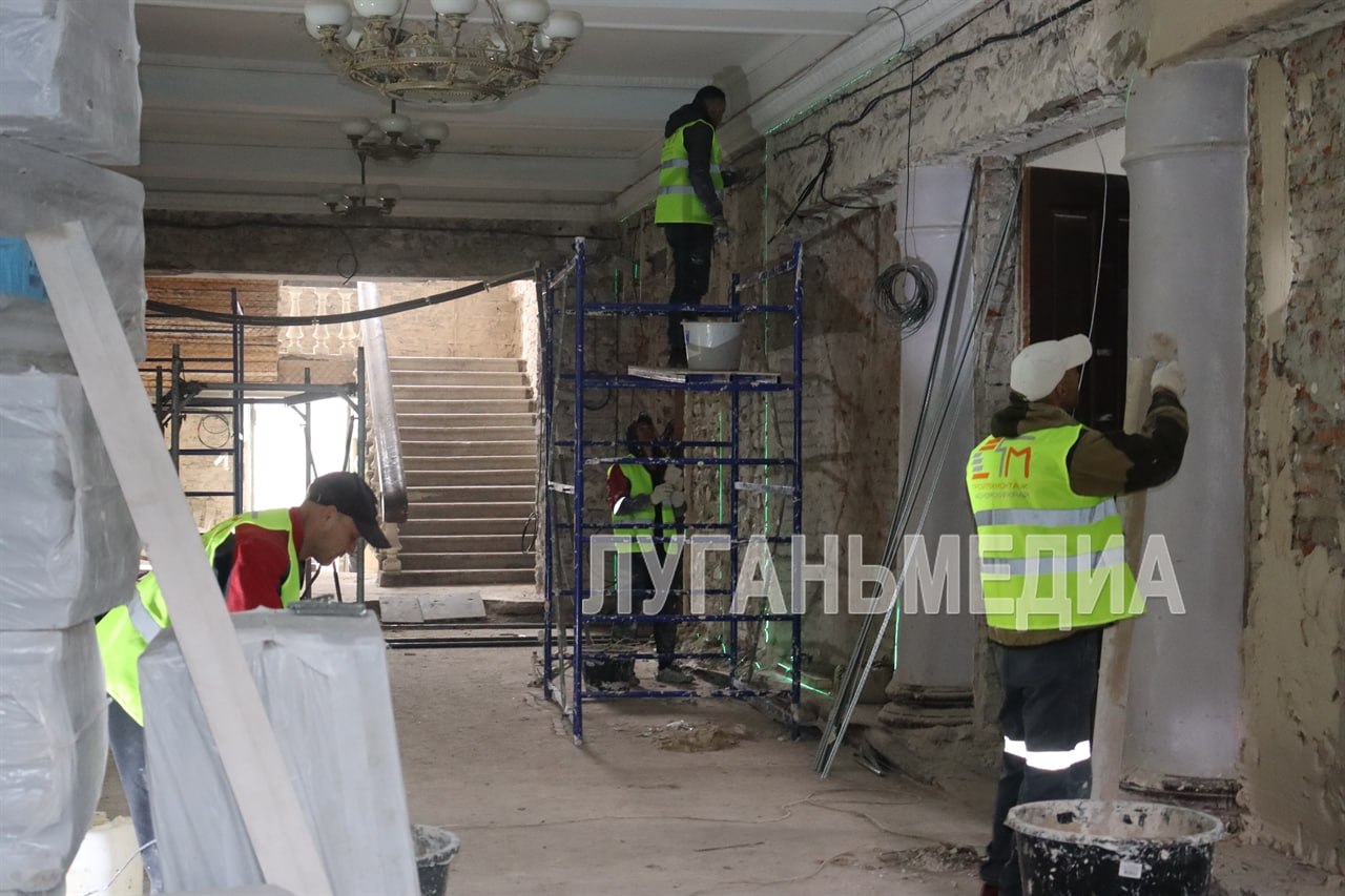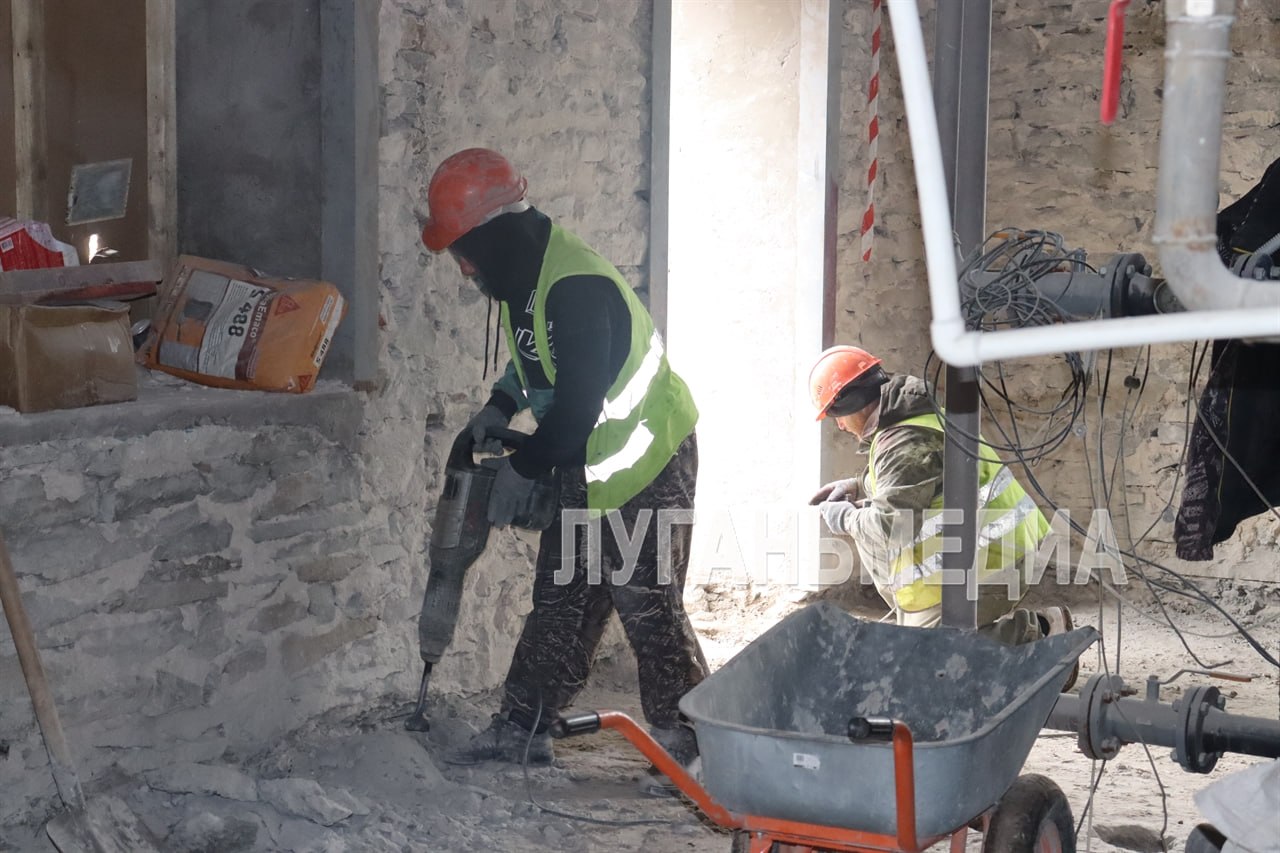 На объекте трудятся 58 специалистов. Задействована спецтехника: погрузчик и манипулятор. Как рассказал заместитель начальника отдела организации и проведения реставрационных работ КГКУ «УКС» Красноярского края Вячеслав Кабаев, сейчас рабочие выполняют частичный ремонт помещений, отделочные работы, ремонтируют кровлю здания площадью 1 534 кв. м, прокладывают инженерные сети. Руководитель делегации Красноярского края в Свердловском муниципалитете Виктор Ермаков добавил, что в этом году в планах также ремонт фасада.