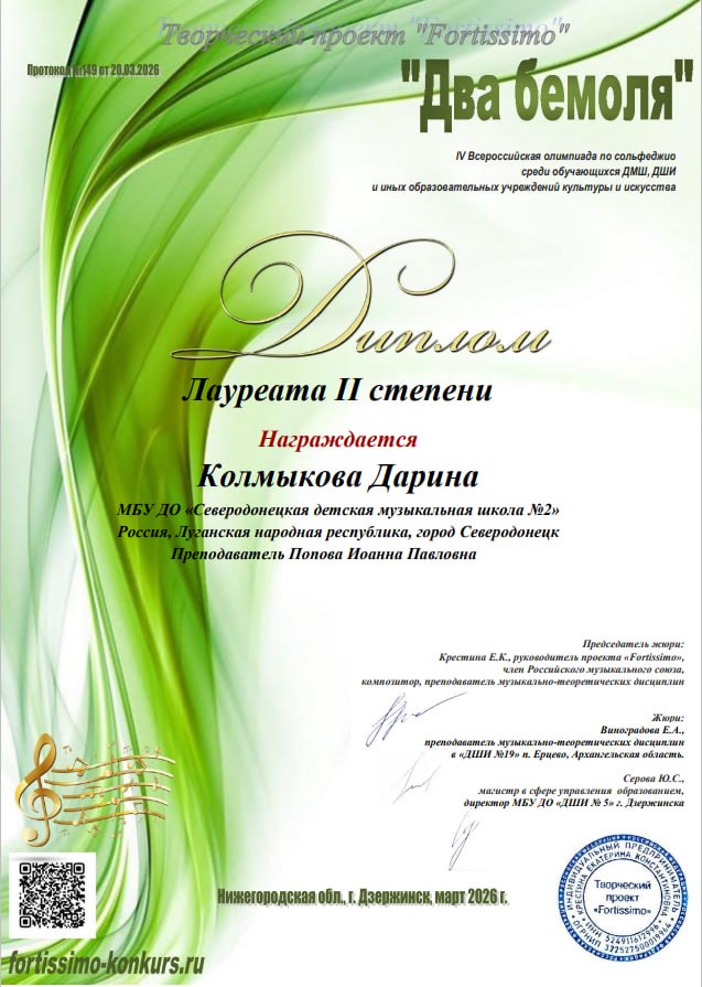 Творческий проект Fortissimo подвл итоги IV Всероссийской Олимпиады по сольфеджио "Два бемоля". Учащаяся СДМШ №2 Дарина Колмыкова вошла в список победителей, став лауреатом II степени.