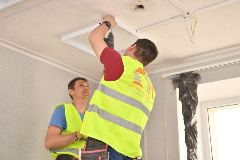 Начальник участка Руслан Бекенов докладывает, что все работы идут по графику и поэтапно: «На данный момент проводится прокладка кабелей по в кабинетах, монтируется осветительное оборудование, меняется розеточная часть и выключатели. Также ведутся работы по монтажу силовых кабелей и прокладке магистралей. Сейчас специалисты работают на втором этаже и приступают к третьему».