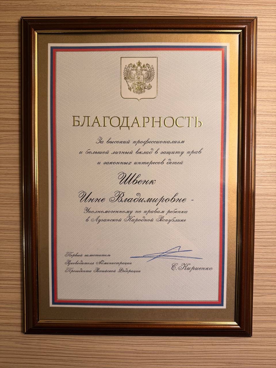 Полученная Благодарность «За высокий профессионализм и значительный личный вклад в защиту прав и законных интересов детей». Это не только личное достижение, а признание усилий моего аппарата. Подтверждение того, что наша совместная работа по обеспечению прав и законных интересов детей приносит ощутимые результаты.