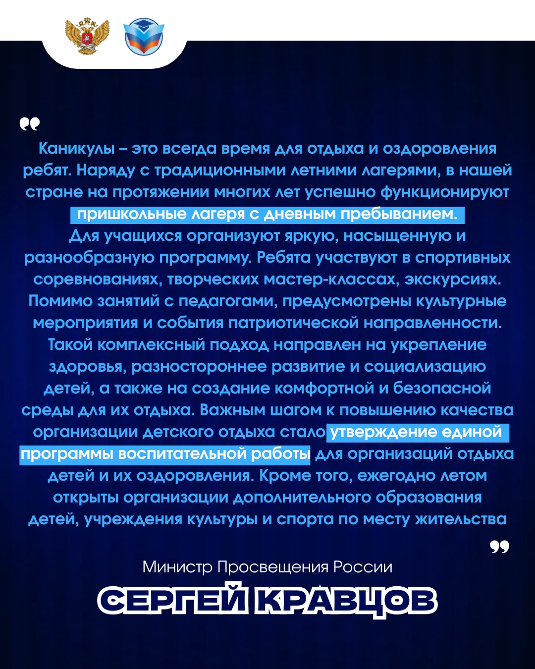 При этом пришкольные лагеря, экскурсии, мастер-классы и спорт — будут. Напомним, что в 2025 году летней оздоровительной кампанией было охвачено более 6 миллионов детей.