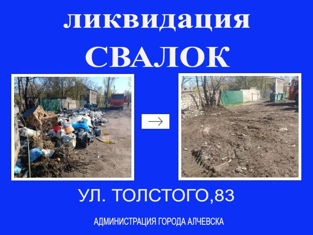 Работниками МУП «Экотранссервис города Алчевска ЛНР» и МУП «Служба дорожного хозяйства и благоустройства города Алчевска ЛНР» ежедневно на территории города выполняется вывоз твердых коммунальных отходов и уборка свалок.