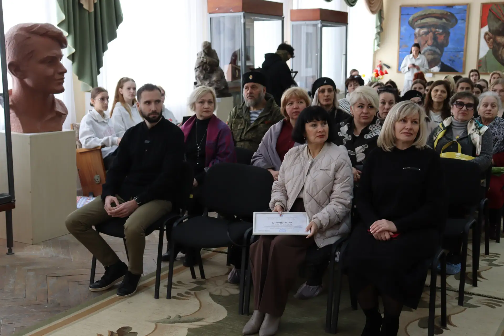 Проект «О Родине» в Стаханове лично представил его автор и идейный вдохновитель Иван Чухновский — художник-живописец, участник СВО, ветеран боевых действий. Для него тема Родины — это личный опыт, который проходит через весь выставочный проект.
