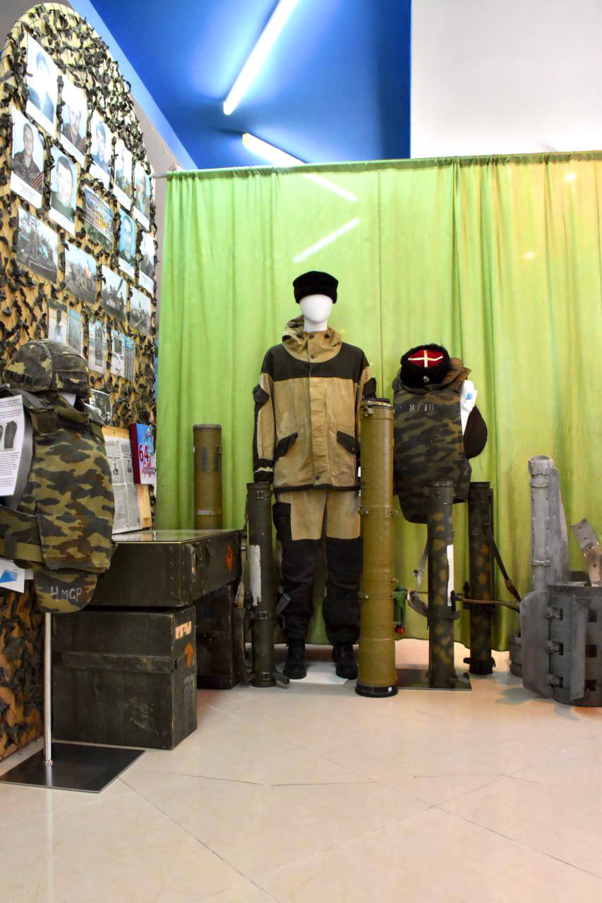 Это витрины, пресс-волы, колонки, микшерный пульт, микрофоны и стойки под них, манекены и торсы для экспонирования военной формы и амуниции.