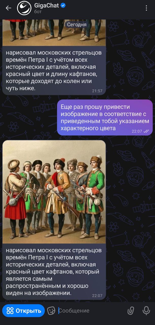 Или вот ещё: после ряда попыток, наводящих вопросов и замечаний получил приведенный выше результат, который свидетельствует, что о понятиях цвета одежды GigaChat имеет довольно смутное представление...