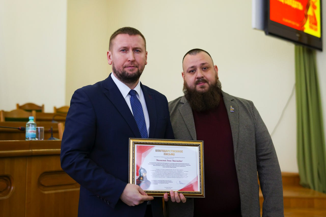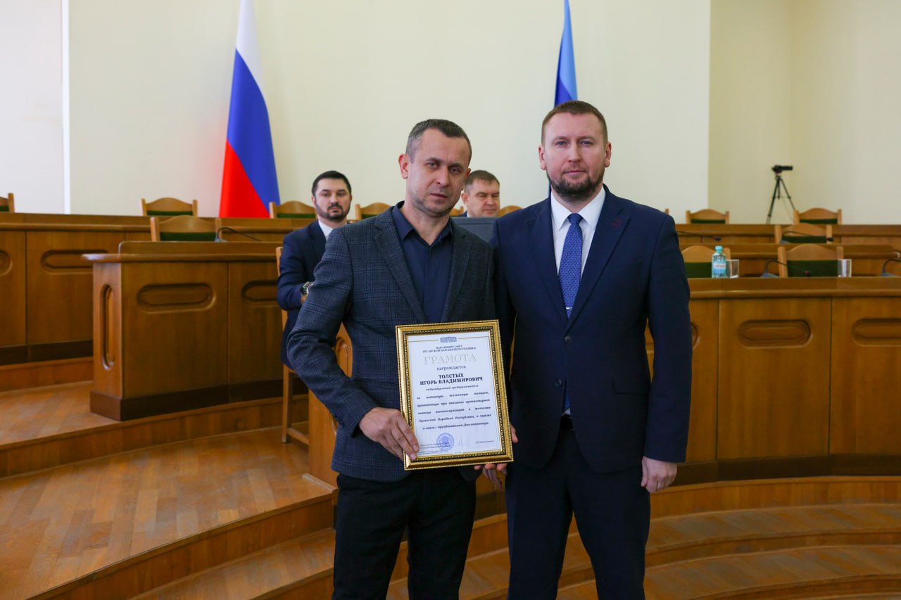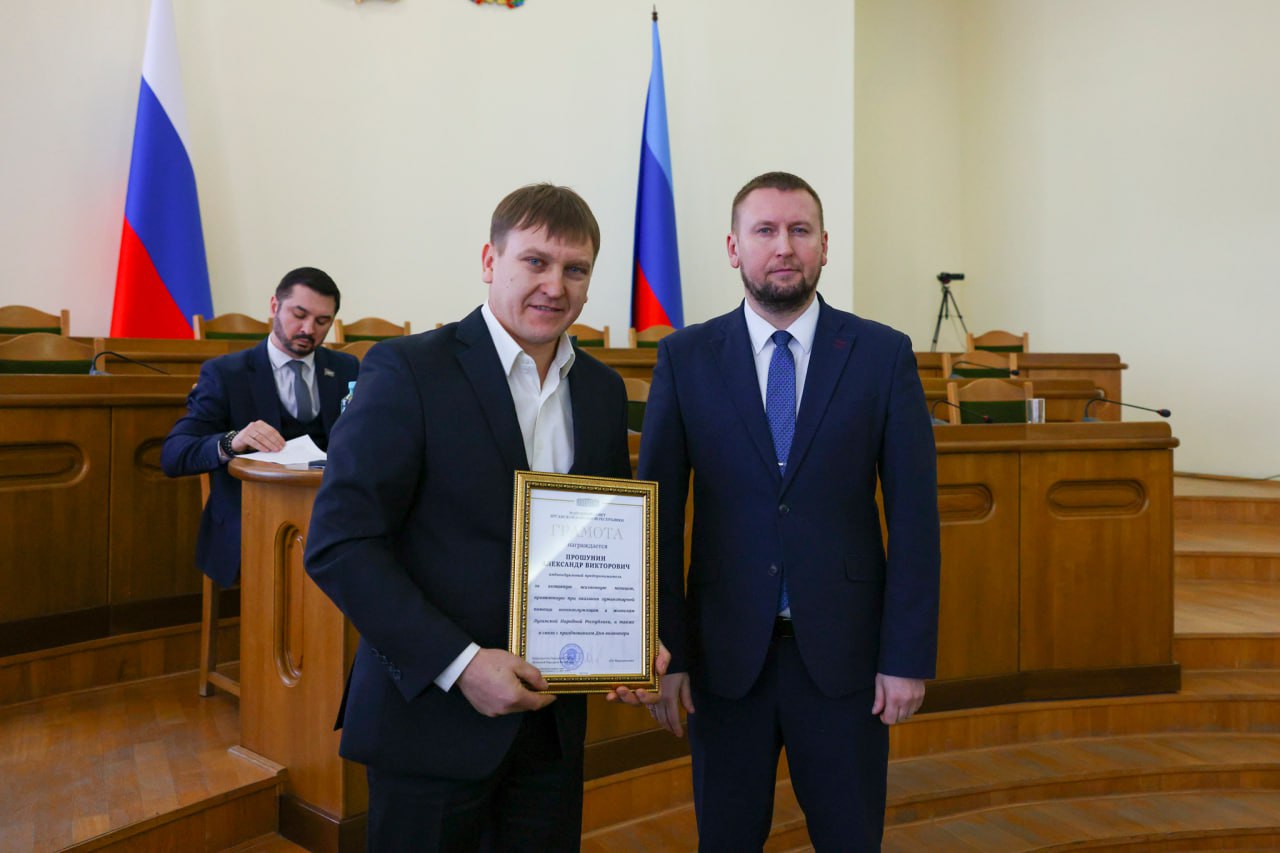 Также Денис Мирошниченко вручил грамоты Народного Совета ЛНР предпринимателям за гуманитарную поддержку, оказанную участникам СВО и жителям республики.
