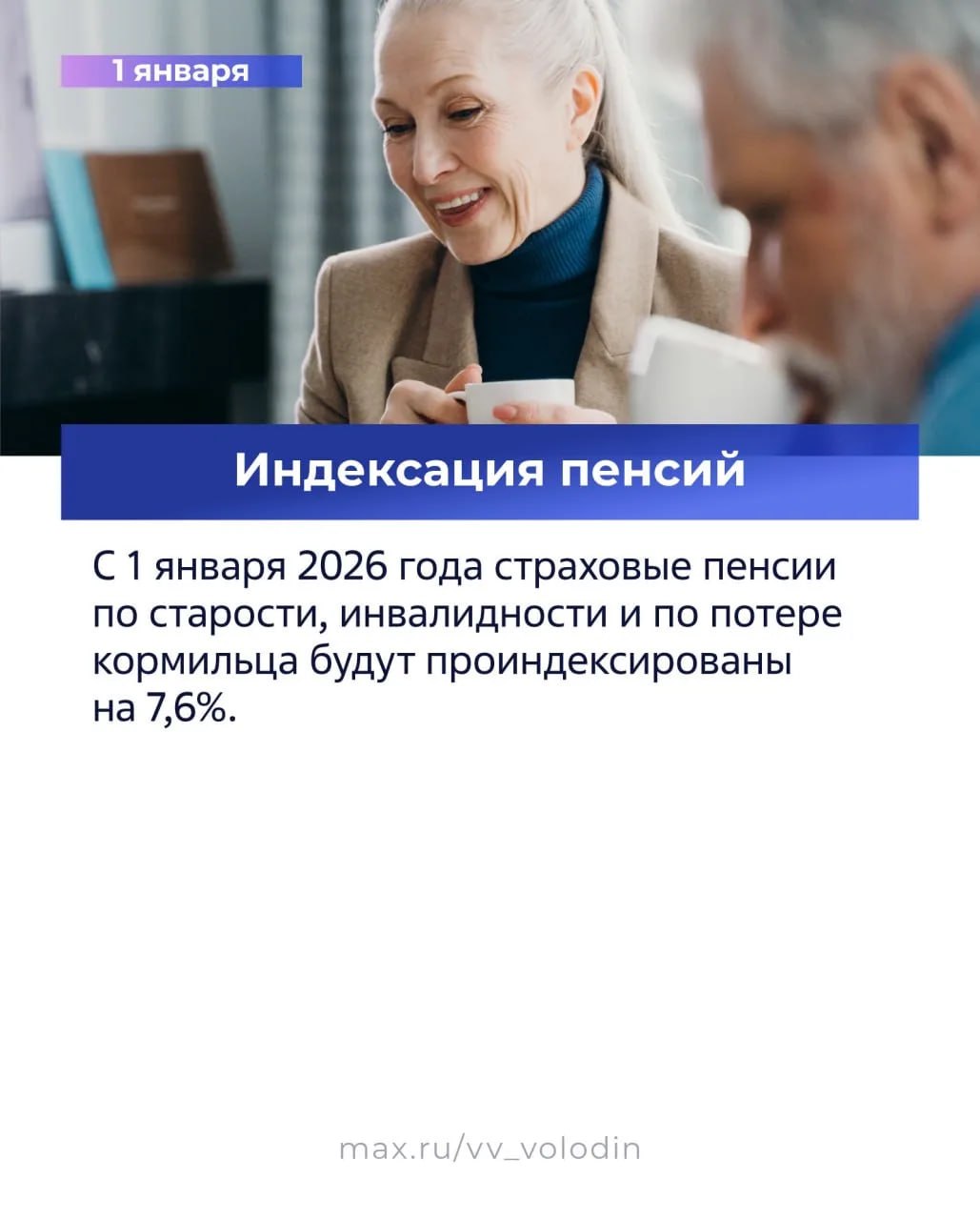 увеличится прожиточный минимум и ряд социальных выплат, а страховые пенсии проиндексируют на 7,6 %;