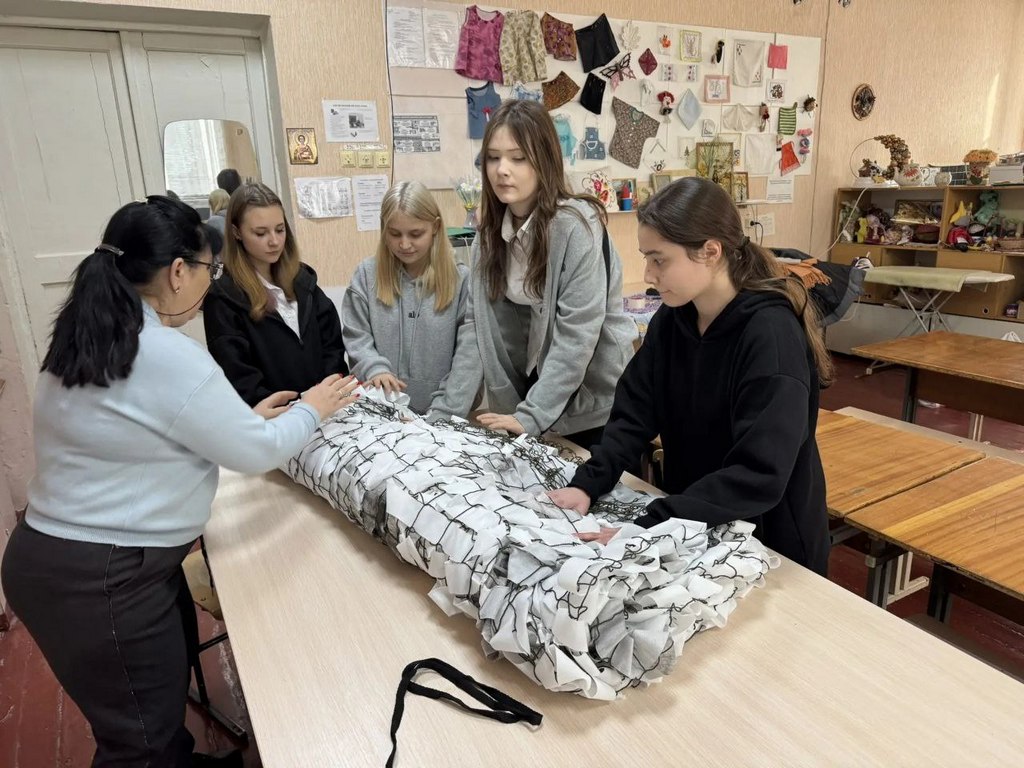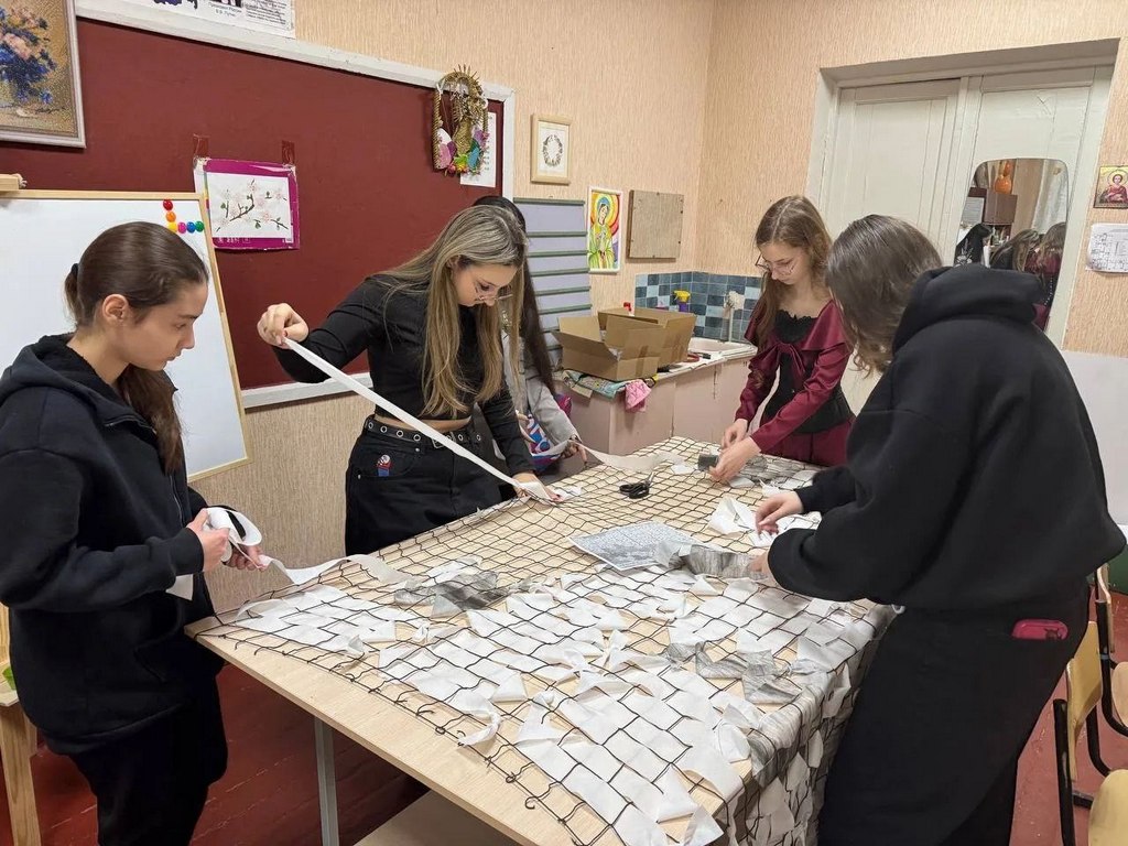 Члены УИК и учащиеся Стаханова плетут маскировочные сети для военнослужащих СВО