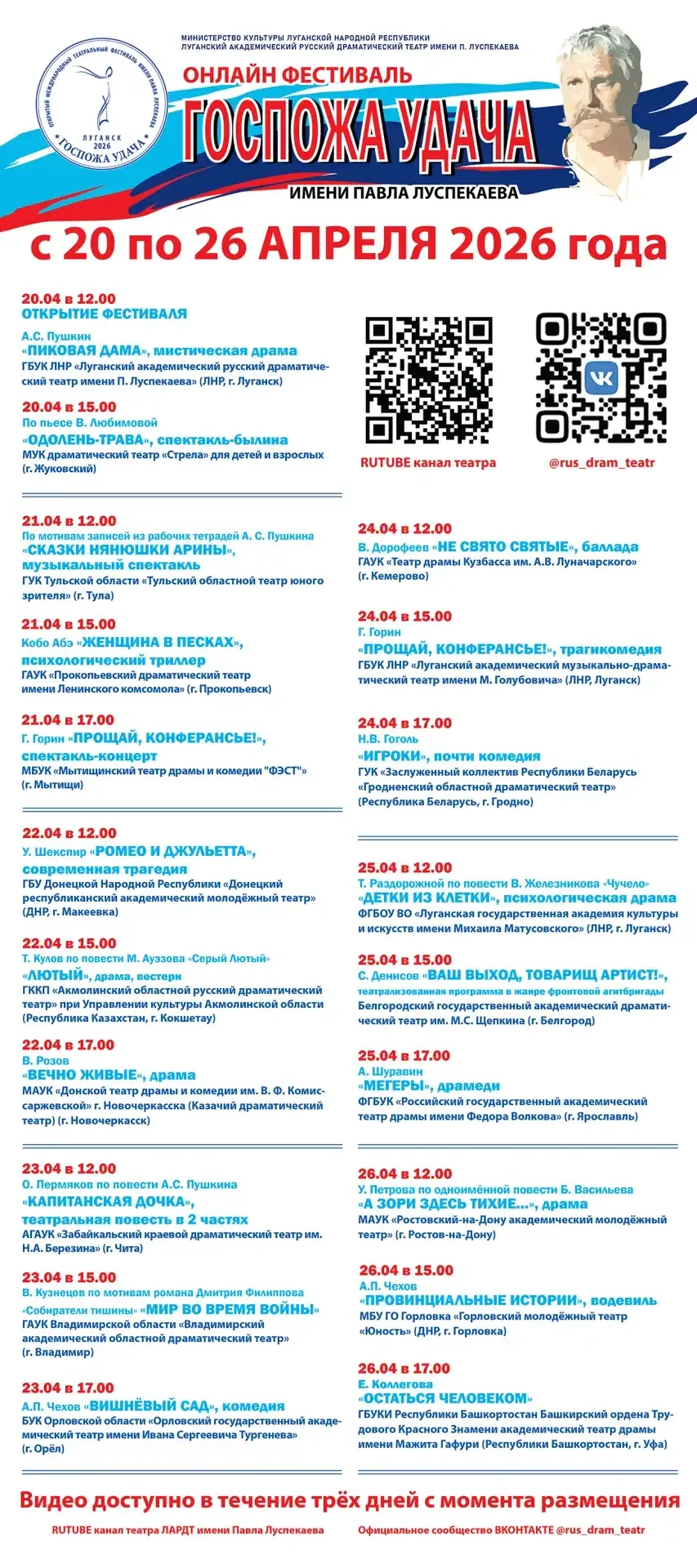 Подробная информация о программе и расписании — в официальной группе ВКонтакте Луганского академического русского драматического театра им. П. Луспекаева.